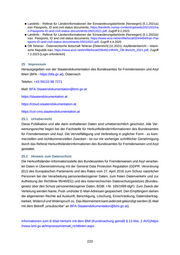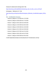 Hinweise für elektronische Anbringen (96,7 KB) https://www.bfa.gv.at/Kontakt/files/Kundmachung_nach_13_Abs_2_und_5_AVG.pdf Amtssignatur – Bildmarke (117,7 KB) https://www.bfa.gv.at/Impressum/files/Amtssignatur_Bildmarke_Veroeffentlichungstext_2020.p df 25.3 Veröffentlichte Versionen • Version 9, Gültig von 17-10-2024 bis 17-07-2025 • Version 8, Gültig von 26-06-2024 bis 17-10-2024 • Version 7, Gültig von 26-01-2024 bis 26-06-2024 • Version 6, Gültig von 13-04-2023 bis 26-01-2024 • Version 5, Gültig von 23-05-2022 bis 13-04-2023 • Version 4, Gültig von 22-12-2021 bis 23-05-2022 • Version 3, Gültig von 01-07-2021 bis 22-12-2021 • Version 2, Gültig von 29-01-2021 bis 01-07-2021 • Version 1, Gültig von 29-06-2020 bis 29-01-2021 © 2025 Staatendokumentation des Bundesamtes für Fremdenwesen und Asyl 224