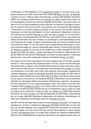 die Aktivitäten von MEK-Mitgliedern im Exil (Landinfo 28.11.2022). Im Juni 2018 wurde ein ge planter Anschlag auf ein MEK-Treffen nahe Paris vereitelt (ÖB Teheran 11.2021; vgl. BMIH/BfV 7.6.2022) und auch in Albanien sollen Veranstaltungen, an denen MEK-Mitglieder teilnehmen wollten, von Anschlägen bedroht worden sein (Landinfo 28.11.2022). Darüber hinaus haben sich die Feindseligkeiten zwischen der Islamischen Republik und der MEK in den letzten Jahren vor allem in Form von Cyber-Kriegsführung sowie politischen und rechtlichen Kampagnen manifes tiert. Im Dezember 2023 hat die iranische Justiz begonnen, über 100 angebliche MEK-Mitglieder in Abwesenheit zu verurteilen (Amwaj 14.12.2023). Es wird vermutet, dass die MEK verdeckte Operationen und Informationskampagnen von ihren ausländischen Stützpunkten in Albanien und Frankreich aus durchführt (Intercept 11.2.2023; vgl. CNN 5.10.2022). Im Juni 2023 führten die albanischen Sicherheitsbehörden eine Razzia im Camp Ashraf 3 durch, wobei albanische Medien berichtet haben, dass dies im Rahmen von Ermittlungen zu Internetkriminalität geschah. Die Ansiedelung der Gruppe in Albanien hatte Befürchtungen über iranische Angriffe auf das Land aufkommen lassen. Im Jahr 2022 brach Tirana die diplomatischen Beziehungen zu Tehe ran ab und beschuldigte Iran, massive Cyberangriffe gegen Albanien zu führen (FR24 20.6.2023; vgl. Amwaj 14.12.2023). Ein Ziel Irans ist die Auslieferung von MEK-Anhängern an das Land (Amwaj 14.12.2023; vgl. IRINTL 7.5.2024). Nach Beginn der israelischen Militäroperation ge gen Iran Mitte Juni 2025 hat eine Hackergruppe, die mit den Revolutionsgarden in Verbindung gebracht wird, erneut einen Cyberangriff in Albanien durchgeführt (Politico 21.6.2025). Die Gruppe hat sich sowohl organisatorisch als auch strategisch über die Zeit stark verändert, hält aber an ihrem Hauptziel eines Regimewechsels in Iran fest. Obwohl die MEK behauptet, das iranische Volk zu vertreten, und ihre Rolle bei den Protesten der letzten Jahre betont, gibt es kaum Anzeichen dafür, dass sie in Iran signifikante Unterstützung erhält (Landinfo 12.4.2021). Laut Beobachtern ist die MEK unter Iranern aller politischen Ausrichtungen ausgesprochen unbeliebt (Intercept 11.2.2023; vgl. Newsweek 16.6.2025, NYT 26.6.2025). Die MEK spielt im politischen Leben innerhalb Irans keine Rolle (CRS 25.2.2025). In den letzten Jahren scheint sie sich darauf zu konzentrieren, die öffentliche Meinung zu beeinflussen und als praktikable Alternative zum derzeitigen Regime internationale Unterstützung zu gewinnen. Die Organisa tion führt umfassende PR- und Lobbying-Kampagnen durch, unter anderem durch den oben erwähnten NRWI (Landinfo 12.4.2021). Früher galt die MEK als marxistisch, heute pflegt sie Kontakte zu rechtskonservativen Parteien wie den US-Republikanern (taz 11.2.2024; vgl. CNN 10.7.2023) und der spanischen Vox (taz 11.2.2024; vgl. Spiegel 21.11.2023) sowie Vertretern der Berliner CDU (BZ 13.9.2023). Die Finanzierungsquellen der MEK bleiben undurchsichtig, aber die Gruppe organisiert regelmäßig Kundgebungen und öffentliche Veranstaltungen, an denen auch ausländische Würdenträger teilnehmen (Intercept 11.2.2023). Die MEK unterhält seit langem Beziehungen mit Israel (Newsweek 16.6.2025). Die Gruppierung bestreitet zwar, mit Israel zu kollaborieren (Newsweek 16.6.2025), laut Berichten aus dem Jahr 2012 hat die MEK allerdings in der Vergangenheit Training und Finanzmittel von Israel (und den USA) erhalten, und zwar mit dem Ziel, das iranische Atomprogramm zu stören (Haaretz 7.4.2012; vgl. Bob/Evyatar 2023). Nur wenige Tage vor Beginn der israelischen Militäroperation Mitte Juni 2025 veröffentlichte die Gruppierung Informationen, die angeblich belegen, dass Iran 27