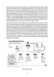 Der Präsident ist nach dem Revolutionsführer der zweithöchste Amtsträger im Staat. Er bildet ein Regierungskabinett, das vom Parlament bestätigt werden muss (FH 2025). Das iranische Regierungssystem ist damit ein semipräsidiales und an der Spitze der Regierung steht der vom Volk für vier Jahre direkt gewählte Präsident (ÖB Teheran 11.2021), der jeweils für zwei hintereinanderfolgende Amtszeiten zur Wahl antreten darf (FH 2025). Der Präsident ist für das tagespolitische Geschäft zuständig und hat einen bedeutsamen Einfluss auf die Innen- und Au ßenpolitik des Landes (BBC 1.7.2024). Seine Macht ist allerdings vergleichsweise beschränkt, vor allem in Sicherheitsfragen (BBC 1.7.2024; vgl. BPB 10.1.2020). Die Befugnisse des ge wählten Präsidenten werden durch den Revolutionsführer und andere nicht gewählte Instanzen eingeschränkt (FH 2025), wie auch durch das Parlament (BBC 1.7.2024). Das iranische Parlament mit 290 Abgeordneten, genannt Majles, hat eine Kammer und wird alle vier Jahre direkt gewählt. Das Majles ist die Legislative des Landes, genehmigt das Staats budget, ratifiziert internationale Abkommen (DW 20.6.2025) und kann Ministern das Misstrauen aussprechen (ÖB Teheran 11.2021; vgl. AA 19.3.2025). Neben den Parlamentsabgeordneten können auch Minister Gesetzesvorschläge einbringen (DW 16.6.2021; vgl. AA 19.3.2025). Die Autorität des Parlaments wird durch den Wächterrat eingeschränkt, der alle Parlamentskandi daten vorselektiert (DW 20.6.2025) und [vom Parlament beschlossene] Gesetze ablehnen kann, die seiner Meinung nach nicht mit der Verfassung oder den Grundsätzen des Islam vereinbar sind (DW 20.6.2025; vgl. FH 2025). Die Kandidaten für Parlamentssitze erhalten ihre Unterstüt zung nicht von Parteien, sondern von klerikalen und wirtschaftlichen Interessengruppen (DW 16.6.2021; vgl. FP 7.3.2024). Quelle 1: BPB 10.1.2020 5