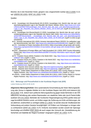 Pressefreiheit: Die meisten Fernsehsender und Radiostationen in der KRI sind parteipolitisch beeinflusst (AA 28.10.2022, S.9). Die Demokratische Partei Kurdistans (KDP) und die Patrioti sche Union Kurdistans (PUK) gewähren Sendern, die ihnen gehören oder nahestehen, privile gierten Zugang zu Informationen. In den KDP-Hochburgen (Erbil und Dohuk) sind dies Kurdistan Television, Rudaw und K24, im von der PUK dominierten Gouvernement Sulaymaniyah sind es Kurdsat News und GK Television. Sender von Oppositionsparteien oder solche, die unabhän gig sind, erhalten im Gegenzug nur begrenzen Zugang zu Informationen (USDOS 20.3.2023). Oppositionelle Medien werden in ihrer Tätigkeit beeinträchtigt, und es kommt wiederholt auch zu Verhaftungen von kritischen Journalisten, teilweise mit unverhältnismäßigen Freiheitsstrafen, auch wenn Angeklagte im Kontext der sogenannten „ Badinan“-Prozesse gegen Journalisten in der KRI zum Teil milder bestraft bzw. amnestiert wurden (AA 28.10.2022, S.9). Im Jahr 2020 kam es zu einer Verschärfung des Vorgehens der Behörden der KRG gegen Medien und Journalisten, insbesondere gegen solche, die über Proteste gegen die KRG im Zusammenhang mit wirtschaftlicher Not und Korruption berichteten (FH 3.3.2021a). So wurden Journalisten, die über die regierungsfeindlichen Proteste in der Region Kurdistan berichteten, von den Behörden behindert, bedroht und gefährdet. Auch Demonstranten und Organisatoren von Protesten, sowie Blogger, die COVID-19-Maßnahmen, Korruption und die Nichtauszahlung von Staatsgehältern kritisiert haben, wurden verhaftet (FH 3.3.2021a). In einigen Fällen trugen die Angreifer Militär- oder Polizeiuniformen der KRG (USDOS 12.4.2022). Mit Stand April 2022 verbüßten drei Journalisten, die von den Behörden der KRG verurteilt worden waren, Haftstrafen wegen ihrer Arbeit (FH 2023). Im Jahr 2020 wurden mehrere Büros des Medienunternehmens Nalia Radio und Fernsehen (NRT) geschlossen und durchsucht (FH 3.3.2021a). Im Dezember 2020 wurde die Sendelizenz des Senders ausgesetzt (FH 3.3.2021a; vgl. AA 22.1.2021, S.11). NRT hat zuvor über Gewalt während regierungsfeindlicher Proteste berichtet (FH 3.3.2021a). Während dieser Proteste hat die KRG die Internetdienste in der KRI für acht Stunden abgeschaltet (DFAT 16.1.2023, S.28). Seit August 2020 wurden schätzungsweise 76 Journalisten, Aktivisten und Lehrer aus der Re gion Badinan von Sicherheitskräften festgenommen und in Erbil inhaftiert. Den sogenannten „ Badinan-Gefangenen“ wird vorgeworfen, die nationale Sicherheit gefährdet und Spionage be trieben zu haben, da sie Kontakt zu den Konsulaten der USA, Deutschlands und Frankreichs, der Vertretung der Europäischen Union in Bagdad und der irakischen Bundesregierung aufgenom men hatten. Am 12. und 13.7.2021 fanden Gerichtsverhandlungen zu neun Badinan-Aktivisten statt, nachdem sie etwa ein Jahr lang auf ihren Prozess warten mussten. Die Gerichtsverfah ren werden als Teil eines Versuchs der Kurdischen Demokratischen Partei (KDP) gesehen, die Meinungsfreiheit in der KRI zu unterdrücken (CPT 3.8.2021). Auch im Jahr 2021 haben die kurdischen Behörden die Verfolgung von Journalisten verschärft, die über Misswirtschaft, Korruption und regierungsfeindliche Proteste in der Region berichtet haben. Die kurdischen Behörden nehmen routinemäßig Journalisten rechtswidrig fest und inhaf tieren sie. Rechtsbeistand wird verhindert und Verurteilungen erfolgen aufgrund fadenscheiniger Anschuldigungen ohne rechtmäßige Verfahren. Im Februar 2021 verurteilte ein Gericht im von 150