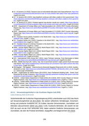 ■ AJ - Al Jazeera (1.8.2022): Tensions soar as rival protests take place near Iraqi parliament, https://ww w.aljazeera.com/news/2022/8/1/tensions-soar-as-rival-protests-take-place-near-iraqi-parliament , Zugriff 25.8.2023 ■ AJ - Al Jazeera (30.5.2022): Iraqi deadlock continues with elites unable to form government, https: //www.aljazeera.com/news/2022/5/30/iraqi-deadlock-continues-with-elites-unable-to-form-governm ent, Zugriff 24.8.2023 ■ AJ - Al Jazeera (5.11.2021): Protests against Iraq election results turn violent, https://www.aljazeer a.com/news/2021/11/5/iraq-protesters-take-to-the-streets-and-clash-with-police , Zugriff 25.8.2023 ■ DFAT - Department of Foreign Affairs and Trade [Australien] (16.1.2023): DFAT Country Information Report Iraq, https://www.ecoi.net/en/file/local/2085737/country-information-report-iraq.pdf , Zugriff 2.2.2023 ■ DFAT - Department of Foreign Affairs and Trade [Australien] (17.8.2020): DFAT Country Information Report Iraq, https://www.ecoi.net/en/file/local/2036511/country-information-report-iraq.pdf , Zugriff 20.6.2023 ■ FH - Freedom House (2023): Freedom in the World 2023 - Iraq, https://www.ecoi.net/de/dokument /2090187.html, Zugriff 7.7.2023 ■ FH - Freedom House (24.2.2022): Freedom in the World 2022 - Iraq, https://www.ecoi.net/de/doku ment/2068634.html, Zugriff 11.7.2023 ■ FH - Freedom House (3.3.2021a): Freedom in the World 2021 – Iraq, https://www.ecoi.net/en/docu ment/2046520.html, Zugriff 11.7.2023 ■ HRW - Human Rights Watch (12.1.2023): World Report 2023 - Iraq, https://www.ecoi.net/en/docu ment/2085461.html, Zugriff 15.2.2023 ■ HRW - Human Rights Watch (13.1.2022): World Report 2022 - Iraq, https://www.ecoi.net/en/docu ment/2066472.html, Zugriff 13.7.2023 ■ HRW - Human Rights Watch (13.1.2021): World Report 2021 - Iraq, https://www.ecoi.net/de/doku ment/2043505.html, Zugriff 16.8.2023 ■ ICG - International Crisis Group (26.7.2021): Iraq’s Tishreen Uprising: From Barricades to Ballot Box, https://www.ecoi.net/en/file/local/2056850/223-iraq-tishreen.pdf, Zugriff 22.6.2023 ■ MEE - Middle East Eye (25.7.2021): Iraq: Son of prominent women’s rights activist found shot dead near Basra, https://www.middleeasteye.net/news/iraq-son-prominent-iraqi-rights-activist-shot-dea d-near-basra, Zugriff 18.5.2023 ■ ÖB Bagdad - ÖB Bagdad - Österreichische Botschaft Bagdad [Österreich] (20.11.2022): Asyllän derbericht zu Irak, https://www.ecoi.net/en/file/local/2094775/IRAK_ÖB Bericht_2022_11.odt, Zugriff 12.7.2023 [Login erforderlich] ■ OWP - Organization for World Peace (29.8.2022): Iraq’s Parliament Building Falls: ‘Green Zone’ Breached By Al-Sadr Protestors, https://theowp.org/iraqs-parliament-building-falls-green-zone-bre ached-by-al-sadr-protestors/ , Zugriff 16.8.2023 ■ USDOS - United States Department of State [USA] (20.3.2023): 2022 Country Report on Human Rights Practices: Iraq, https://www.ecoi.net/de/dokument/2089064.html, Zugriff 11.7.2023 ■ USDOS - United States Department of State [USA] (12.4.2022): 2021 Country Report on Human Rights Practices: Iraq, https://www.ecoi.net/de/dokument/2071125.html, Zugriff 24.8.2023 ■ USDOS - United States Department of State [USA] (30.3.2021): 2020 Country Report on Human Rights Practices: Iraq, https://www.ecoi.net/de/dokument/2048100.html, Zugriff 11.7.2023 14.1.1 Versammlungsfreiheit in der Kurdistan Region Irak (KRI) Letzte Änderung 2023-10-09 16:25 Sicherheitskräfte der Kurdischen Regionalregierung (KRG) unterdrückten auch 2022 das Recht auf Versammlungsfreiheit (AI 28.3.2023). Sie setzten willkürliche Verhaftungen, Einschüch terung und juristische Schikanen ein, um Kritiker, darunter Demonstranten, Journalisten und Aktivisten abzuschrecken (DFAT 16.1.2023, S.26). Kurdische Behörden, die sowohl mit der KDP als auch mit der PUK verbunden sind, haben weiterhin friedliche Demonstranten und Journalisten, die über die Proteste berichteten, angegriffen und festgenommen (FH 2023). 156