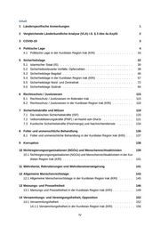 Inhalt 1 Länderspezifische Anmerkungen 1 2 Vergleichende Länderkundliche Analyse (VLA) i.S. § 3 Abs 4a AsylG 2 3 COVID-19 3 4 Politische Lage 4 4.1 Politische Lage in der Kurdistan Region Irak (KRI) . . . . . . . . . . . . . . . . 16 5 Sicherheitslage 22 5.1 Islamischer Staat (IS) . . . . . . . . . . . . . . . . . . . . . . . . . . . . . . . . 30 5.2 Sicherheitsrelevante Vorfälle, Opferzahlen . . . . . . . . . . . . . . . . . . . . . 38 5.3 Sicherheitslage Bagdad . . . . . . . . . . . . . . . . . . . . . . . . . . . . . . . 46 5.4 Sicherheitslage in der Kurdistan Region Irak (KRI) . . . . . . . . . . . . . . . . 57 5.5 Sicherheitslage Nord- und Zentralirak . . . . . . . . . . . . . . . . . . . . . . . 72 5.6 Sicherheitslage Südirak . . . . . . . . . . . . . . . . . . . . . . . . . . . . . . . 94 6 Rechtsschutz / Justizwesen 115 6.1 Rechtsschutz / Justizwesen im föderalen Irak . . . . . . . . . . . . . . . . . . . 115 6.2 Rechtsschutz / Justizwesen in der Kurdistan Region Irak (KRI) . . . . . . . . . 118 7 Sicherheitskräfte und Milizen 119 7.1 Die irakischen Sicherheitskräfte (ISF) . . . . . . . . . . . . . . . . . . . . . . . 120 7.2 Volksmobilisierungskräfte (PMF) / al-Hashd ash-Sha‘bi . . . . . . . . . . . . . 121 7.3 Kurdische Sicherheitskräfte (Peshmerga) und Nachrichtendienste . . . . . . . 134 8 Folter und unmenschliche Behandlung 136 8.1 Folter und unmenschliche Behandlung in der Kurdistan Region Irak (KRI) . . . 137 9 Korruption 138 10 Nichtregierungsorganisationen (NGOs) und Menschenrechtsaktivisten 139 10.1 Nichtregierungsorganisationen (NGOs) und Menschenrechtsaktivisten in der Kur distan Region Irak (KRI) . . . . . . . . . . . . . . . . . . . . . . . . . . . . . . . 141 11 Wehrdienst, Rekrutierungen und Wehrdienstverweigerung 141 12 Allgemeine Menschenrechtslage 143 12.1 Allgemeine Menschenrechtslage in der Kurdistan Region Irak (KRI) . . . . . . 145 13 Meinungs- und Pressefreiheit 146 13.1 Meinungs und Pressefreiheit in der Kurdistan Region Irak (KRI) . . . . . . . . . 149 14 Versammlungs- und Vereinigungsfreiheit, Opposition 152 14.1 Versammlungsfreiheit . . . . . . . . . . . . . . . . . . . . . . . . . . . . . . . . 152 14.1.1 Versammlungsfreiheit in der Kurdistan Region Irak (KRI) . . . . . . . . . 156 IV