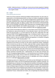 ■ MEMO - Middle East Monitor (17.9.2020): Iraq: Female activist and family slaughtered in Baghdad, https://www.middleeastmonitor.com/20200917-iraq-female-activist-and-family-slaughtered-in-bag hdad/, Zugriff 17.8.2023 19.2 Kinder Letzte Änderung 2024-03-28 08:37 Artikel 29 und 30 der irakischen Verfassung enthalten Kinderschutzrechte. Der Irak ist dem Zu satzprotokoll zur UN-Kinderrechtskonvention zum Schutz von Kindern in bewaffneten Konflikten beigetreten (AA 28.10.2022, S. 11). Das irakische Strafgesetzbuch gewährt Eltern das Recht, ihre Kinder innerhalb der durch Gesetz oder Gewohnheit vorgeschriebenen Grenzen zu diszi plinieren (USDOS 20.3.2023; vgl. HRW 12.1.2023). Kinder sind einerseits in überproportionaler Weise von der schwierigen humanitären Lage, andererseits durch Gewaltakte gegen sie selbst oder gegen Familienmitglieder stark betroffen (AA 28.10.2022, S. 11). Laut UNICEF machen Kinder fast die Hälfte der durch den Konflikt vertriebenen Iraker aus (USDOS 20.3.2023). Vor der COVID-19-Krise lebten laut UNICEF 22,1 % der Kinder in Armut. Eine der Auswirkungen der Pandemie ist, dass sich der Anteil der in Armut lebenden Kinder im Jahr 2021 auf 37,9 % erhöht hat (AA 28.10.2022, S. 11). Einem Bericht für das Jahr 2021 zufolge leben 38 % aller irakischen Kinder in Armut (USDOS 12.4.2022). Über 1,16 Millionen Kinder im Alter von unter fünf Jahren waren unterernährt (AA 25.10.2021, S. 12). Im Jahr 2022 sind laut UNICEF 1,1 Millionen Kinder im Irak auf humanitäre Unterstützung angewiesen, ein deutlicher Rückgang zum Vorjahr (3,3 Mio. Kinder) (AA 28.10.2022, S. 11). Nach dem Gesetz ist der Vater der Vormund seiner Kinder. Einer geschiedenen Mutter kann das Sorgerecht für ihre Kinder bis zum Alter von zehn Jahren zugesprochen werden, verlängerbar durch ein Gericht bis zum Alter von 15 Jahren, wobei die Kinder zu diesem Zeitpunkt wählen können, bei welchem Elternteil sie leben möchten (USDOS 20.3.2023). Das irakische Famili enrecht unterscheidet zwischen zwei Arten der Vormundschaft (wilaya und wasiya), sowie der Pflege bzw. Sorge (hadana). Dem Vater kommt immer die Vormundschaft (wilaya) zu. Wenn dieser nicht mehr lebt, dem Großvater bzw. nach Entscheidung eines Shari‘a-Gerichts einem anderen männlichen Verwandten [Anm.: väterlicherseits]. Nur ein Mann kann demnach wali sein. Die Fürsorgeberechtigung (hadana), d. h. die Verantwortung für die Erziehung, Sicherheit und Betreuung eines Kindes, kommt im Falle einer Scheidung der Mutter zu. D. h. die Kinder leben bei der Mutter, im Falle von Knaben bis zum 13. Lebensjahr und im Falle von Mädchen bis zum 15. Lebensjahr (Migra/Landinfo 15.8.2018). Die Regierung setzte sich im Allgemeinen für die Rechte und das Wohlergehen der Kinder ein, verweigert jedoch Kindern, die nicht die Staatsbürgerschaft besitzen, staatliche Leistungen. Die Nichtregistrierung von Geburten hat zur Folge, dass dem betroffenen Kind staatliche Leistungen, wie Bildung, Lebensmittelbeihilfe und Gesundheitsversorgung vorenthalten sind. Alleinstehende Frauen und Witwen hatten oft Probleme, ihre Kinder registrieren zu lassen, obwohl die Behörden in den meisten Fällen nach der Registrierung der Geburt durch das Gesundheits- und das Innen ministerium Geburtsurkunden ausstellt. Diese Registrierung ist ein langwieriger und bisweilen komplizierter Prozess. Insbesondere bei Kindern, die von Angehörigen des Islamischen Staats 219