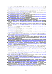 ■ Amwaj - Amwaj Media (18.1.2022): New Generation Movement: A new alternative in Iraqi Kurdistan?, https://amwaj.media/article/new-generation-movement-a-new-alternative-in-iraqi-kurdistan , Zugriff 28.8.2023 ■ AN - Arab News (26.3.2023): Iraq’s Kurdistan region to hold elections on Nov. 18 — spokesman, https://www.arabnews.com/node/2275921/middle-east, Zugriff 30.3.2023 ■ Bas - BasNews (28.12.2023): IHEC Announces Final Results of Provincial Council Elections, https: //www.basnews.com/en/babat/834687, Zugriff 31.1.2024 ■ BS - Bertelsmann Stiftung (23.2.2022): BTI 2022 Country Report Iraq, https://www.ecoi.net/en/file/l ocal/2069660/country_report_2022_IRQ.pdf, Zugriff 11.7.2023 ■ BS - Bertelsmann Stiftung (29.4.2020): BTI 2020 Country Report Iraq, https://www.ecoi.net/en/file/l ocal/2029486/country_report_2020_IRQ.pdf, Zugriff 10.8.2021 ■ CRS - Congressional Research Service [USA] (18.5.2022): Iraq and U.S. Policy, https://crsreports.c ongress.gov/product/pdf/IF/IF10404/38, Zugriff 28.8.2023 [Login erforderlich] ■ DFAT - Department of Foreign Affairs and Trade [Australien] (16.1.2023): DFAT Country Information Report Iraq, https://www.ecoi.net/en/file/local/2085737/country-information-report-iraq.pdf , Zugriff 2.2.2023 ■ DFAT - Department of Foreign Affairs and Trade [Australien] (17.8.2020): DFAT Country Information Report Iraq, https://www.ecoi.net/en/file/local/2036511/country-information-report-iraq.pdf , Zugriff 20.6.2023 ■ FH - Freedom House (2023): Freedom in the World 2023 - Iraq, https://www.ecoi.net/de/dokument /2090187.html, Zugriff 7.7.2023 ■ FH - Freedom House (24.2.2022): Freedom in the World 2022 - Iraq, https://www.ecoi.net/de/doku ment/2068634.html, Zugriff 11.7.2023 ■ FH - Freedom House (3.3.2021b): Freedom in the World 2021 – Iraq, https://www.ecoi.net/en/docu ment/2046520.html, Zugriff 28.8.2023 ■ FIKDP - Fondation Institut Kurde de Paris (31.10.2018): The final results of the parliamentary elec tions in Kurdistan, https://www.institutkurde.org/en/info/the-final-results-of-the-parliamentary-elect ions-in-kurdistan-1232551449.html , Zugriff 28.8.2023 ■ FSC-I - Federal Supreme Court-Iraq [Irak] (16.2.2022): Federal Supreme Court judges that the Kurdistan Regional Government’s oil and gas law is unconstitutional and annulled, https://www.iraq fsc.iq/news.4807/, Zugriff 28.8.2023 ■ Gov.KRD - Kurdistan Regional Government [Irak] (15.2.2022): KRG Statement on Tuesday’s Ruling of the Iraqi Federal Supreme Court, https://gov.krd/english/news-and-announcements/posts/2022/ february/krg-statement-on-tuesday-s-ruling-of-the-iraqi-federal-supreme-court/ , Zugriff 28.8.2023 ■ K24 - Kurdistan 24 (12.11.2020): Iraq’s parliament passes deficit law, despite Kurdish objection, https://www.kurdistan24.net/en/story/23479-Iraq’s-parliament-passes-deficit-law,-despite-Kurdish -objections, Zugriff 28.8.2023 [Login erforderlich] ■ KPI - Kurdistan Parliament - Iraq [Irak] (o.D.): Kurdistan Parliament - Iraq: Parties in the Kurdistan Parliament, https://www.parliament.krd/english/members-and-parties/parties/, Zugriff 28.8.2023 ■ MD - Modern Diplomacy (20.11.2022): Northern Iraq and the Kurdistani Disputed Territories, https: //moderndiplomacy.eu/2022/11/20/northern-iraq-and-the-kurdistani-disputed-territories/ , Zugriff 28.8.2023 ■ MEI - Middle East Institute (24.2.2021): Beyond the elite: Taking protest and public opinion seriously in the Kurdistan Region, https://www.mei.edu/publications/beyond-elite-taking-protest-and-public-o pinion-seriously-kurdistan-region , Zugriff 11.5.2023 ■ NINA - National Iraqi News Agency (30.12.2023): A unified Arab bloc formed in Kirkuk, https://nina news.com/Website/News/Details?key=1098324, Zugriff 31.1.2024 ■ ÖB Bagdad - ÖB Bagdad - Österreichische Botschaft Bagdad [Österreich] (20.11.2022): Asyllän derbericht zu Irak, https://www.ecoi.net/en/file/local/2094775/IRAK_ÖB Bericht_2022_11.odt, Zugriff 12.7.2023 [Login erforderlich] ■ Pres.KRD - The Presidency of the Kurdistan Region [Irak] (3.3.2024): President Nechirvan Barzani announces the date of the Kurdistan Parliament election, https://presidency.gov.krd/en/president-n echirvan-barzani-announces-the-date-of-the-kurdistan-parliament-election/ , Zugriff 5.3.2024 ■ Rudaw - Rudaw Media Network (25.2.2024): Christian parties blame KDP, PUK for losing quota seats in Iraq court ruling, https://www.rudaw.net/english/kurdistan/25022024, Zugriff 5.3.2024 ■ Rudaw - Rudaw Media Network (18.12.2023): What do Iraq’s provincial elections mean for Kirkuk’s Kurds?, https://www.rudaw.net/english/middleeast/iraq/181220231, Zugriff 14.2.2024 21