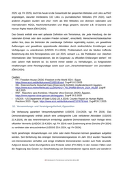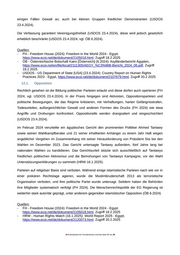 2025; vgl. FH 2025), doch bis heute ist die Gesamtzahl der gesperrten Websites und Links auf 562 angestiegen, darunter mindestens 132 Links zu journalistischen Websites (FH 2024), nach anderen Angaben wurden seit 2017 mehr als 650 Websites von diversen nationalen und internationalen NGOs, Nachrichtenkanälen und Blogs gesperrt, darunter z.B. Al-Jazeera und Human Rights Watch (ÖB 6.2024). Das Gesetz enthält eine weit gefasste Definition von Terrorismus, die „jede Handlung, die der nationalen Einheit oder dem sozialen Frieden schadet“, einschließt. Menschenrechtsbeobachter stellen fest, dass die Behörden die zweideutige Definition regelmäßig nutzten, um gewaltfreie Äußerungen und gewaltfreie oppositionelle Aktivitäten durch strafrechtliche Ermittlungen und Verfolgungen zu unterdrücken (USDOS 23.4.2024). Problematisch sind die Medien treffende Bestimmung des Anti-Terrorgesetzes vom Juli 2015, wonach u.a. die Publikation von „falschen Informationen über Terroroperationen, die im Gegensatz zu offiziellen Erklärungen stehen“, mit zwei Jahren Haft bedroht ist. Es kommt immer wieder zu Verhaftungen, zu fortgesetzten Inhaftierungen ohne Rechtsgrundlage sowie auch zum „Verschwindenlassen“ von Journalisten (ÖB 6.2024). Quellen: - FH - Freedom House (2024): Freedom in the World 2024 - Egypt. https://www.ecoi.net/de/dokument/2105018.html, Zugriff 18.2.2025 - ÖB - Österreichische Botschaft Kairo [Österreich] (6.2024): Asylländerbericht Ägypten, https://www.ecoi.net/en/file/local/2111305/AEGY_%C3%96B-Bericht_2024_06.pdf, Zugriff 18.2.2025 - RSF - Reporters sans frontières / Reporter ohne Grenzen (2025): Ägypten, https://www.reporter-ohne-grenzen.de/aegypten, Zugriff 26.2.2025 - USDOS - US Department of State [USA] (23.4.2024): Country Report on Human Rights Practices 2023 - Egypt, https://www.ecoi.net/de/dokument/2107679.html, Zugriff 20.2.2025 12. Versammlungs- und Vereinigungsfreiheit, Opposition Die Verfassung garantiert Versammlungsfreiheit (USDOS 23.4.2024; vgl. FH 2024). Das Demonstrationsgesetz enthält jedoch eine umfangreiche Liste verbotener Aktivitäten (USDOS 23.4.2024), die das Innenministerium ermächtigt, geplante Demonstrationen nach Vorlage eines offiziellen Vermerks (USDOS 23.4.2024; vgl. FH 2024) nach Zustimmung eines Gerichts (FH 2024) zu verbieten oder einzuschränken (USDOS 23.4.2024; vgl. FH 2024). Nicht genehmigte Versammlungen von zehn oder mehr Personen können gewaltsam aufgelöst werden. Seit Einführung des strengen Demonstrationsgesetzes im Jahr 2013 wurden Tausende von Demonstranten verhaftet, und einige inhaftierte Demonstranten wurden zum Tode verurteilt. Aufgrund dieses harten Durchgreifens sind Proteste selten (FH 2024). In den meisten Fällen setzt die Regierung das Gesetz zur Einschränkung von Demonstrationen rigoros durch und wendet in .BFA Bundesamt für Fremdenwesen und Asyl Seite 16 von 38