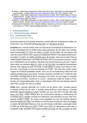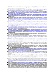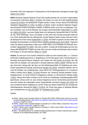 ■ BMLV - Bundesministerium für Landesverteidigung [Österreich] (4.7.2024): Interview der Staaten dokumentation mit einem Länderexperten ■ BS - Bertelsmann Stiftung (2024): BTI 2024 Country Report - Somalia, https://bti-project.org/filea dmin/api/content/en/downloads/reports/country_report_2024_SOM.pdf, Zugriff 18.3.2024 ■ HIPS - Heritage Institute for Policy Studies (1.2023): Security Sector Reform in Somalia: Challenges and Opportunities, https://8v90f1.p3cdn1.secureserver.net/wp-content/uploads/2023/01/Security-S ector-Reform-Jan-31.pdf , Zugriff 22.1.2024 ■ HO - Hiiraan Online (1.1.2025): AUSSOM takes over security operations in Somalia, https://www. hiiraan.com/news4/2025/Jan/199629/aussom_takes_over_security_operations_in_somalia.aspx , Zugriff 3.1.2025 ■ HO - Hiiraan Online (23.6.2024): AU Security Council proposes new Somalia mission to support state-building, https://www.hiiraan.com/news4/2024/Jun/196812/au_security_council_proposes_n ew_somalia_mission_to_support_state_building.aspx?utm_source=hiiraan&utm_medium=Somali NewsUpdateFront, Zugriff 27.6.2024 ■ HO - Hiiraan Online (1.2.2024b): AU mission concludes second phase of troop withdrawal from Somalia, https://www.hiiraan.com/news4/2024/Feb/194836/au_mission_concludes_second_phas e_of_troop_withdrawal_from_somalia.aspx?utm_source=hiiraan&utm_medium=SomaliNewsUpda teFront, Zugriff 19.4.2024 ■ HO - Hiiraan Online (3.7.2023b): Somalia Receives 7 Military Bases from ATMIS, https://www.hiiraa n.com/news4/2023/July/192078/somalia_receives_7_military_bases_from_atmis.aspx?utm_sourc e=dlvr.it&utm_medium=twitter, Zugriff 22.1.2024 ■ ISS/Dessu - Institute for Security Studies (Herausgeber), Meressa K. Dessu (Autor) (29.3.2022): Is the AU mission in Somalia changing in name only, https://issafrica.org/iss-today/is-the-au-mission- in-somalia-changing-in-name-only#:~:text=The African Union (AU)„to the Somali Security Forces, Zugriff 19.4.2024 ■ ÖB Nairobi - Österreichische Botschaft Nairobi [Österreich] (19.11.2024): Wochenbericht 11.11.- 17.11.2024, per e-Mail an die Staatendokumentation ■ ÖB Nairobi - Österreichische Botschaft Nairobi [Österreich] (10.2024): Asylländerbericht zu Somalia, https://www.ecoi.net/en/file/local/2116331/SOMA_ÖB-Bericht_2024_10.pdf , Zugriff 22.10.2024 [Login erforderlich] ■ RD - Radio Dalsan (16.11.2023): Security council extends AU mission in Somalia, https://www.radi odalsan.com/security-council-extends-au-mission-in-somalia-implements-phased-drawdown-and -sanctions-rollover, Zugriff 19.4.2024 ■ Sahan/SWT - Somali Wire Team (Autor), Sahan (Herausgeber) (5.1.2024): Effects of Ethiopia- Somalia Diplomatic Row on South West State, in: The Somali Wire Issue No. 631, per e-Mail [kostenpflichtig, Login erforderlich] ■ Sahan/SWT - Somali Wire Team (Autor), Sahan (Herausgeber) (3.7.2023): Kenya and Ethiopia under pressure from Al-Shabaab: Uncertainty among Front Line States, in: The Somali Wire Issue No. 560, per e-Mail [kostenpflichtig, Login erforderlich] ■ SG - Somali Guardian (19.3.2024): Children among 18 civilians killed in Turkish drone strike near Somalia’s capital, https://somaliguardian.com/news/somalia-news/children-among-18-civilians-kille d-in-turkish-drone-strike-near-somalias-capital , Zugriff 18.4.2024 ■ Soufan - Soufan Center, The (29.2.2024): IntelBrief: Somalia-Türkiye Defense Deal and the Regional Implications for East Africa, https://thesoufancenter.org/intelbrief-2024-february-29 , Zugriff 19.4.2024 ■ SWP/Kurtz/Roll/Lossow - Stiftung Wissenschaft und Politik (Herausgeber), Gerrit Kurtz (Autor), Stephen Roll (Autor), Tobias von Lossow (Autor) (28.10.2024): Escalations Risks in the Horn of Africa, https://www.swp-berlin.org/10.18449/2024C50, Zugriff 2.12.2024 ■ UNGA - United Nations General Assembly (23.8.2024): Report of the Independent Expert on the situation of human rights in Somalia, Isha Dyfan (A/HRC/57/80) [EN/AR/RU/ZH] - Somalia, https: //reliefweb.int/attachments/de0a5efb-ba80-4c3f-9692-054f1a04f1cc/g2414208.pdf , Zugriff 13.11.2024 ■ UNSC - United Nations Security Council (27.9.2024): Situation in Somalia - Report of the Secretary- General [S/2024/698], https://www.ecoi.net/en/file/local/2116024/n2426310.pdf, Zugriff 14.11.2024 ■ UNSC - United Nations Security Council (10.10.2022): Letter dated 10 October 2022 from the Chair of the Security Council Committee pursuant to resolution 751 (1992) concerning Somalia addressed to the President of the Security Council: Letter dated 1 September 2022 from the Panel of Experts on Somalia addressed to the Chair of the Security Council Committee pursuant to resolution 751 147