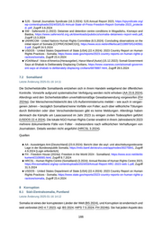 Quellen ■ AA - Auswärtiges Amt [Deutschland] (23.8.2024): Bericht über die asyl- und abschiebungsrelevante Lage in der Bundesrepublik Somalia, https://milo.bamf.de/otcs/cs.exe/app/nodes/30275841, Zugriff 4.9.2024 [Login erforderlich] ■ BS - Bertelsmann Stiftung (2024): BTI 2024 Country Report - Somalia, https://bti-project.org/filea dmin/api/content/en/downloads/reports/country_report_2024_SOM.pdf, Zugriff 18.3.2024 ■ FH - Freedom House (2024a): Freedom in the World 2024 - Somaliland, https://www.ecoi.net/de/do kument/2109065.html, Zugriff 8.7.2024 ■ USDOS - United States Department of State [USA] (22.4.2024): 2023 Country Report on Human Rights Practices - Somalia, https://www.state.gov/reports/2023-country-reports-on-human-rights-p ractices/somalia, Zugriff 23.4.2024 10 Ombudsmann 10.1 Süd-/Zentralsomalia, Puntland Letzte Änderung 2024-12-06 11:23 Die Verfassung sieht eine Menschenrechtskommission vor (USDOS 22.4.2024). Diese ist jedoch nie eingerichtet worden (USDOS 22.4.2024; vgl. UNHRCOM 6.5.2024; AA 23.8.2024). Folglich gibt es seitens der Bundesregierung bislang keine Mechanismen, um Menschenrechtsvergehen aufzuklären (USDOS 22.4.2024). In Puntland gibt es eine Menschenrechtskommission, die sich auch öffentlich für die Einhaltung von Menschenrechten einsetzt (AA 23.8.2024). Das Budget des Puntland’s Human Rights De fender wurde von Präsident Deni reduziert. Diese Einrichtung untersucht Vorwürfe von Bürgern, tritt für Opfer ein, deren Rechte verletzt worden sind, und legt jährlich einen Bericht über die Menschenrechtssituation in Puntland vor (SD 22.8.2022). Quellen ■ AA - Auswärtiges Amt [Deutschland] (23.8.2024): Bericht über die asyl- und abschiebungsrelevante Lage in der Bundesrepublik Somalia, https://milo.bamf.de/otcs/cs.exe/app/nodes/30275841, Zugriff 4.9.2024 [Login erforderlich] ■ SD - Somali Dispatch (22.8.2022): Puntland Cuts Office of Human Rights Defender’s budget, https: //www.somalidispatch.com/latest-news/puntland-cuts-office-of-human-rights-defenders-budget , Zugriff 5.6.2024 ■ UNHRCOM - United Nations Human Rights Committee (6.5.2024): Concluding observations on the initial report of Somalia [CCPR/C/SOM/CO/1], https://www.ecoi.net/en/file/local/2108970/G240561 3.pdf, Zugriff 24.5.2024 ■ USDOS - United States Department of State [USA] (22.4.2024): 2023 Country Report on Human Rights Practices - Somalia, https://www.state.gov/reports/2023-country-reports-on-human-rights-p ractices/somalia, Zugriff 23.4.2024 10.2 Somaliland Letzte Änderung 2024-12-06 11:24 Im Unterschied zum Rest Somalias gibt es in Somaliland ein den Statuten nach unabhängiges Menschenrechtsinstitut [Anm.: Somaliland National Human Rights Commission]. Dieses bemüht sich nach den Pariser Prinzipien zu arbeiten, ist jedoch Versuchen politischer Einflussnahme 172