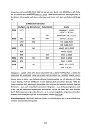 einzuheben, verbessert (BS 2024). 2022 hob sie laut einer Quelle noch 263 Millionen US-Dollar ein, 2023 waren es 329 Millionen (HIPS 7.5.2024). Dabei entwickelten sich die Budgetzahlen in den letzten Jahren stetig nach oben, wobei das Land immer noch stark von Gebern abhängig ist: (Halqabsi 17.1.2024; UNSC 27.9.2024; Sahan/SWT 18.12.2023; VOA/Maruf 27.12.2022; HO 16.11.2022; RD 28.12.2022; UNSC 10.10.2022; HO 30.6.2022; GN 1.11.2021; SPA 18.3.2021) Abseits davon ist die ins Land fließende offizielle Entwicklungshilfe von 1,5 Milliarden US-Dollar im Jahr 2018 auf mehr als 3 Milliarden im Jahr 2020 deutlich gewachsen. Etwa die Hälfte der Entwicklungshilfe fließt allerdings in humanitäre Hilfe. Aufgrund der fehlenden Kontrolle über das Territorium – aber auch hinsichtlich technischer Fähigkeiten – war die Regierung bisher nicht in der Lage, ein nationales Steuersystem aufzubauen, und sie hat darauf auch kein Monopol. Durch die Bundesregierung werden Steuern v. a. in und um Mogadischu eingehoben. Daneben erheben auch die Regierungen der Bundesstaaten Steuern (BS 2024). Arbeitslosenquote: Hinsichtlich konkreter Zahlen zur Arbeitslosigkeit gibt es unterschiedlichste und teils widersprüchliche Angaben: 310
