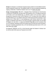 Energie: Der Mangel an zuverlässiger Energieversorgung stellt für die wirtschaftliche Entwick lung ein erhebliches Hindernis dar. Laut Weltbank haben nur 16% der somalischen Bevölkerung Zugang zu Elektrizität, in ländlichen Gebieten sind es nur 3 % (ENPO 28.6.2023). Hunger, Versorgungslage / IPC: [IPC = Integrated Phase Classification for Food Security; 1-moderat bis 5-Hungersnot]. Mit Stand Feber 2025 befanden sich ca. 3,0 Millionen Menschen in IPC-Stufe 3 (15 % der Bevölkerung); ca. 440.000 in Stufe 4 (2 %) und keine in Stufe 5 (Hungersnot). Zusammen mit den rund 6,5 Millionen in IPC 2 ist etwas mehr als die Hälfte der Gesamtbevölkerung von 19,3 Millionen Menschen Ernährungsunsicherheit ausgesetzt. Damit befinden sich im Feber 2025 17 % der Bevölkerung in einer höheren Stufe als IPC 2 (IPC 2.2025); im September 2024 waren es 19 % (IPC 23.9.2024). Insgesamt haben sich die Daten im Vergleich zum Jahr 2024 v. a. aufgrund der besseren Regenfälle und der humanitären Hilfe um 15 % verbessert. Allerdings wurde für den Zeitraum April-Juni 2025 eine erneute Verschlech terung der Umstände prognostiziert. Bis zu 23 % der Bevölkerung könnten dann in IPC 3 und höher fallen (IPC 2.2025). Die folgenden Lagekarten von IPC zu Food Insecurity zeigen die Situation im Zeitraum Jän ner 2023 bis März 2025 sowie eine Prognose bis Juni 2025: 317