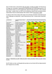 davon 479.000 schwer unterernährten (IPC 29.3.2025; vgl. WFP 27.6.2025). Die Reduzierung im Budget der humanitären Organisationen beeinträchtigt auch Ernährungsprogramme. Die Zahl erreichter Kinder ist um 39 % eingebrochen. Mehrere Ernährungszentren - etwa in Benadir oder Hiiraan - standen Ende Juni 2025 vor der Schließung, wodurch mehr als tausend schwer unterernährte Kinder ihre lebensrettende Hilfe verlieren würden (UN OCHA 6.7.2025). Im Zeitraum Feber 2021 bis März 2025 zeigte sich die Situation hinsichtlich Unterernährung bei unter Fünfjährigen wie folgt [GAM = akute Unterernährung; SAM = schwere akute Unterernäh rung]: Quelle 31: FSNAU/FAO 24.2.2025; FSNAU 25.9.2024; FSNAU 18.9.2023a; FSNAU 10.2.2022; FSNAU 4.2.2021 Die IPC-Stufen zur Unter- und Mangelernährung haben sich seit Herbst 2023 wie folgt entwickelt (inkl. Prognose bis Juni 2025): 320