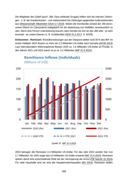einen bedeutenden Anteil des Budgets von Privathaushalten dar, v. a. für die unteren 40 %, wo Remissen 54 % aller Haushaltsausgaben decken (WB 6.2021). Diese Überweisungen tragen wesentlich zum sozialen Sicherungsnetz bei. Allerdings sind sie ungleich verteilt (BS 2024). Schätzungsweise 40 % der somalischen Haushalte erhalten in der einen oder anderen Form Remissen (Sahan/SWT 11.10.2023). IDPs bekommen verhältnismäßig weniger oft Remissen (DI 6.2019, S. 28). Eine Erhebung im November und Dezember 2020 hat gezeigt, dass 22 % der städtischen, 12 % der ländlichen und 6 % der IDP-Haushalte Remissen beziehen (IPC 1.3.2021). Auch die Bevölkerung in Südsomalia – und hier v. a. im ländlichen Raum – empfängt verhältnismäßig weniger Geld als jene in Somaliland oder Puntland. Ein Grund dafür ist, dass dort ein höherer Anteil marginalisierter Gruppen und ethnischer Minderheiten beheimatet ist (RVI/Majid/Abdirahman/Hassan 1.9.2018). Denn auch Minderheiten mangelt es oft am Zugang zu Remissen (SPC 9.2.2022). Laut einer Studie von IOM aus dem Jahr 2021 sind 67 % der Empfänger von Remissen ar beitslos. Für viele Menschen sind die Überweisungen ein Rettungsanker (Sahan/SWT 2.9.2022; vgl. OXFAM 15.12.2023, Star 30.8.2022). Überweisungen werden hauptsächlich für allgemeine Haushaltsausgaben (z. B. Nahrung, Wasser) sowie Bildung und Gesundheit verwendet (UNCDF 4.2023; vgl. OXFAM 15.12.2023). Mindestens 65 % der Haushalte, welche Remissen beziehen, erhalten diese regelmäßig (monatlich), der Rest erhält sie anlassbezogen oder im Krisenfall. Remissen können folglich Fluktuationen im Einkommen bzw. gestiegene Ausgaben ausgleichen. Dies ist gerade in Zeiten einer humanitären Krise wichtig. Durch Remissen können Haushalte Quantität und Qualität der für den Haushalt besorgten Lebensmittel verbessern, und ein sehr großer Teil der Überweisungen wird auch für Lebensmittel aufgewendet. Zusätzlich wird in So malia in Zeiten der Krise auch geteilt. Menschen bitten z. B. andere Personen, von welchen sie wissen, dass diese Remissen erhalten, um Hilfe (RVI/Majid/Abdirahman/Hassan 1.9.2018). Wirtschaftlich steuern Remissen 27-30 % zum BIP bei (AFDB 23.6.2023; vgl. ÖB Nairobi 10.2024) und übersteigen damit die Summe der ins Land kommenden humanitären Hilfe bei Weitem (Sahan/SWT 28.8.2024; vgl. SRF 27.12.2021). Remissen fließen auch aus Somalia ab: Dort arbeiten z. B. mehr als 60.000 Gastarbeiter aus Uganda und Kenia. Alleine jene aus Kenia schicken jährlich 180 Millionen US-Dollar in ihr Heimatland zurück. Bei diesen Gastarbeitern handelt es sich vorwiegend um Fachkräfte z. B. in der Wirtschaft, im Management, im huma nitären Sektor oder im Dienstleistungsbereich (etwa Hotel- und Gastgewerbe) (TEA/Barigaba 28.4.2024). Quellen ■ ACCORD - Austrian Centre for Country of Origin and Asylum Research and Documentation (31.5.2021): Somalia - Al-Schabaab und Sicherheitslage; Lage von Binnenvertriebenen und Rück kehrer·innen [sic]; Schutz durch staatliche und nicht-staatliche Akteure; Dokumentation zum COI- Webinar mit Markus Höhne und Jutta Bakonyi am 5. Mai 2021, https://www.ecoi.net/en/file/local/ 2052555/20210531_COI-Webinar Somalia_ACCORD_Mai 2021.pdf, Zugriff 17.5.2022 ■ AFDB - African Development Bank Group (23.6.2023): Somalia Economic Outlook, https://www.af db.org/en/countries-east-africa-somalia/somalia-economic-outlook , Zugriff 15.12.2023 359