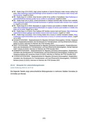■ RE - Radio Ergo (16.8.2023): Food glut in Jowhar as floods prevent farmers from exporting produce to other regions, https://radioergo.org/en/2023/08/food-glut-in-jowhar-as-floods-prevent-farmers-f rom-exporting-produce-to-other-regions/ , Zugriff 13.9.2024 ■ RE - Radio Ergo (11.8.2023): Widowed mother hauled sacks of sand to save up money for her own business, https://radioergo.org/en/2023/08/widowed-mother-hauled-sacks-of-sand-to-save-up-m oney-for-her-own-business/ , Zugriff 13.9.2024 ■ RE - Radio Ergo (12.7.2023): Households suffer in Beletweyne as jobs and property lost in floods, https://radioergo.org/en/2023/07/households-suffer-in-beletweyne-as-jobs-and-property-lost-in-flo ods/, Zugriff 13.9.2024 ■ RE - Radio Ergo (29.6.2023): IDPs in Mogadishu have to choose between caring for sick children and working, https://radioergo.org/en/2024/06/idps-in-mogadishu-have-to-choose-between-carin g-for-sick-children-and-working/ , Zugriff 13.9.2024 ■ RE - Radio Ergo (22.6.2023): High school students in heat-hit Bosasso make money selling fruit juice, https://radioergo.org/en/2023/06/high-school-students-in-heat-hit-bosasso-make-money-selli ng-fruit-juice/, Zugriff 9.4.2024 ■ RE - Radio Ergo (26.5.2023): Parents worried after free school destroyed by flash floods in Mogadishu IDP camp, https://radioergo.org/en/2023/05/parents-worried-after-free-school-destroyed-by-flash-f loods-in-mogadishu-idp-camp/ , Zugriff 9.4.2024 ■ RE - Radio Ergo (17.4.2023): Clan conflict destroys Mudug family homes and businesses, https: //radioergo.org/en/2023/04/clan-conflict-destroys-mudug-family-homes-and-businesses/ , Zugriff 13.9.2024 ■ RE - Radio Ergo (29.3.2023): Educated youth in Mogadishu IDP camps employed as teachers, https://radioergo.org/en/2023/03/educated-youth-in-mogadishu-idp-camps-employed-as-teachers/ , Zugriff 13.9.2024 ■ RE - Radio Ergo (17.3.2023): Hiran farmers’ profits hit by conflict in Somaliland, https://radioergo.or g/en/2023/03/hiran-farmers-profits-hit-by-conflict-in-somaliland/ , Zugriff 9.4.2024 ■ RE - Radio Ergo (18.12.2022): Small businesses in Galkayo boosted after eviction from roadside, https://radioergo.org/en/2022/12/small-businesses-in-galkayo-boosted-after-eviction-from-roadsid e/, Zugriff 12.12.2023 ■ RE - Radio Ergo (6.12.2022): Blockade on supply of stones puts builders in Middle Shabelle out of work, https://radioergo.org/en/2022/12/blockade-on-supply-of-stones-puts-builders-in-middle-sha belle-out-of-work/ , Zugriff 19.11.2024 ■ RE - Radio Ergo (1.12.2022): Poor Galkayo IDP families receive land and houses, https://radioergo. org/en/2022/12/poor-galkayo-idp-families-receive-land-and-houses/ , Zugriff 12.7.2024 ■ RE - Radio Ergo (30.11.2022): Displaced women in Gedo make good money in livestock market, https: //radioergo.org/en/2022/11/displaced-women-in-gedo-make-good-money-in-livestock-market/ , Zugriff 19.11.2024 ■ RE - Radio Ergo (29.11.2022): Somali schoolteachers demoralised by low pay, https://radioergo.or g/en/2022/11/somali-schoolteachers-demoralised-by-low-pay/ , Zugriff 19.11.2024 ■ RE - Radio Ergo (23.11.2022): Poor Galkayo IDP families receive land and houses Somali refugees from Ethiopia struggling for support in Somaliland, https://radioergo.org/en/2022/11/somali-refugee s-from-ethiopia-struggling-for-support-in-somaliland/ , Zugriff 11.7.2024 ■ RE - Radio Ergo (26.10.2022): Displaced from Bay and Bakool seek work and better lives in Gedo, https://radioergo.org/en/2022/10/displaced-from-bay-and-bakool-seek-work-and-better-lives-in-g edo/, Zugriff 19.11.2024 ■ RE - Radio Ergo (24.8.2022): First time in school for Kismayo children from poor backgrounds, https://radioergo.org/en/2022/08/first-time-in-school-for-kismayo-children-from-poor-backgrounds/ , Zugriff 28.6.2024 ■ RE - Radio Ergo (3.8.2022): Cost of living makes tea a luxury in central Somalia’s Adado, https: //radioergo.org/en/2022/08/a-cup-of-tea-becomes-a-luxury-in-central-somalias-adado/ , Zugriff 19.11.2024 ■ RE - Radio Ergo (22.7.2022): Somali businessmen in Jowhar turn to relatives abroad as economy fails, https://radioergo.org/en/2022/07/somali-businessmen-in-jowhar-turn-to-relatives-abroad-as-e conomy-fails/, Zugriff 15.12.2023 ■ RE - Radio Ergo (18.2.2021): Conflict along Hiran-Galmudug road affects jobs and local markets, https://radioergo.org/en/2021/02/18/conflict-along-hiran-galmudug-road-affects-jobs-and-local-mar kets/, Zugriff 19.11.2024 362