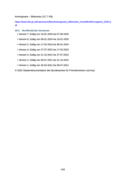 Amtssignatur – Bildmarke (117,7 KB) https://www.bfa.gv.at/Impressum/files/Amtssignatur_Bildmarke_Veroeffentlichungstext_2020.p df 26.3 Veröffentlichte Versionen • Version 7, Gültig von 16-01-2025 bis 07-08-2025 • Version 6, Gültig von 08-01-2024 bis 16-01-2025 • Version 5, Gültig von 17-03-2023 bis 08-01-2024 • Version 4, Gültig von 27-07-2022 bis 17-03-2023 • Version 3, Gültig von 21-10-2021 bis 27-07-2022 • Version 2, Gültig von 08-07-2021 bis 21-10-2021 • Version 1, Gültig von 30-03-2021 bis 08-07-2021 © 2025 Staatendokumentation des Bundesamtes für Fremdenwesen und Asyl 415