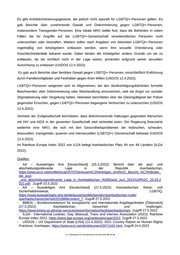 Es gibt Antidiskriminierungsgesetze, die jedoch nicht speziell für LGBTQI+-Personen gelten. Es gab Berichte über zunehmende Gewalt und Diskriminierung gegen LGBTQI+-Personen, insbesondere Transgender-Personen. Eine lokale NRO stellte fest, dass die Behörden in vielen Fällen die für Angriffe auf die LGBTQI+-Gemeinschaft verantwortlichen Personen nicht untersuchten oder bestraften. Weiters sollen nach Angaben von Aktivisten LGBTQI+-Personen regelmäßig von Arbeitgebern entlassen werden, wenn ihre sexuelle Orientierung oder Geschlechtsidentität bekannt wurde. Dabei fanden die Arbeitgeber andere Gründe um sie zu entlassen, da sie rechtlich nicht in der Lage waren, jemanden aufgrund seiner sexuellen Ausrichtung zu entlassen (USDOS 12.4.2022). Es gab auch Berichte über familiäre Gewalt gegen LGBTQI+-Personen, einschließlich Entführung durch Familienmitglieder und Festhalten gegen ihren Willen (USDOS 12.4.2022). LGBTQI+-Personen weigerten sich im Allgemeinen, bei den Strafverfolgungsbehörden formelle Beschwerden über Diskriminierung oder Misshandlung einzureichen, weil sie Angst vor sozialer Stigmatisierung oder Vergeltung hatten. Aktivisten berichteten über die Gleichgültigkeit der Polizei gegenüber Ersuchen, gegen LGBTQI+-Personen begangene Verbrechen zu untersuchen (USDOS 12.4.2022). Vertreter der Zivilgesellschaft berichteten, dass diskriminierende Haltungen gegenüber Menschen mit HIV und AIDS in der gesamten Gesellschaft weit verbreitet seien. Die Regierung finanzierte weiterhin eine NRO, die sich mit den Gesundheitsproblemen der lesbischen, schwulen, bisexuellen, transgender, queeren und intersexuellen (LGBTQI+) Gemeinschaft befasste (USDOS 12.4.2022). Im Rainbow Europe Index 2022 von ILGA belegt Aserbaidschan Platz 49 von 49 Ländern (ILGA 2022). Quellen: - AA – Auswärtiges Amt [Deutschland] (25.3.2022): Bericht über die asyl- und abschiebungsrelevante Lage in der Republik Aserbaidschan, https://www.ecoi.net/en/file/local/2070754/Ausw%C3%A4rtiges_Amt%2C_Bericht_ %C3%Bcber_ die_asyl- _und_abschiebungsrelevante_Lage_in_Aserbaidschan_%28Stand_Juni_2021%29%2C_25.03.2 022.pdf, Zugriff 23.5.2022 - AA – Auswärtiges Amt [Deutschland] (27.5.2022): Aserbaidschan: Reise- und Sicherheitshinweise, LGBTIQ, https://www.auswaertiges-amt.de/de/aussenpolitik/laender/aserbaidschan-node/ aserbaidschansicherheit/201888#content_7, Zugriff 27.5.2022 - BMEIA – Bundesministerium für europäische und internationale Angelegenheiten [Österreich] (27.5.2022): Aserbaidschan, Gesunheit und Impfungen, https://www.bmeia.gv.at/reise-services/reiseinformation/land/aserbaidschan/, Zugriff 27.5.2022 - ILGA - International Lesbian, Gay, Bisexual, Trans and Intersex Association (2022): Rainbow Europe Index 2022, https://www.ilga-europe.org/rainboweurope/2022, Zugriff 27.5.2022 - USDOS – US Department of State [USA] (12.4.2022): 2021 Country Report on Human Rights Practices: Azerbaijan, https://www.ecoi.net/de/dokument/2071162.html, Zugriff 24.5.2022 .BFA Bundesamt für Fremdenwesen und Asyl Seite 34 von 41