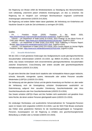 Die Regierung von Bhutan erfüllt die Mindeststandards zur Beseitigung des Menschenhandels nicht vollständig, unternimmt jedoch erhebliche Anstrengungen, um dies zu erreichen. Die Regierung hat im Vergleich zum vorherigen Berichtszeitraum insgesamt zunehmende Anstrengungen unternommen (USDOS 24.6.2024). Die Regierung und andere Stellen haben daran gearbeitet, die Verbreitung von Kinderheirat und häuslicher Gewalt im Laufe der Zeit schrittweise zu verringern (FH 2025). Quellen: - FH – Freedom House (2025): Freedom in the World 2025, https://freedomhouse.org/country/bhutan/freedom-world/2025, Zugriff 5.5.2025 - USDOS – US Department of State [USA] (5.9.2024): 2023 Findings on the Worst Forms of Child Labor: Bhutan, https://www.ecoi.net/de/dokument/2116144.html, Zugriff 8.4.2024 - USDOS – US Department of State [USA] (24.6.2024): 2024 Trafficking in Persons Report: Bhutan, https://www.ecoi.net/de/dokument/2111627.html, Zugriff 8.4.2024 - USDOS – US Department of State [USA] (23.4.2024): 2023 Country Report on Human Rights Practices: Bhutan, https://www.ecoi.net/de/dokument/2107619.html, Zugriff 8.4.2025 17.3. Sexuelle Minderheiten Mit den 2021 in Kraft getretenen Änderungen des Strafgesetzbuchs wurde gleichgeschlechtliches Sexualverhalten entkriminalisiert (USDOS 23.4.2024; vgl. BMEIA 9.5.2025a, AA 9.5.2025, FH 2025). Das Gesetz kriminalisiert nicht einvernehmliches gleichgeschlechtliches Sexualverhalten zwischen Erwachsenen, Cross-Dressing oder andere sexuelle oder geschlechtsspezifische Verhaltensweisen (USDOS 23.4.2024). Es gab keine Berichte über Gewalt durch staatliche oder nichtstaatliche Akteure gegen lesbische, schwule, bisexuelle, transgender, queere, intersexuelle oder andere Personen sexueller Minderheiten (LGBTQI+) (USDOS 23.4.2024). Die Verfassung sah den gleichen Schutz und die gleiche Anwendung von Rechten vor, aber weder die Verfassung noch die Gesetzgebung schützten Einzelpersonen ausdrücklich vor Diskriminierung aufgrund ihrer sexuellen Orientierung, Geschlechtsidentität oder ihres Geschlechtsausdrucks oder ihrer Geschlechtsmerkmale (USDOS 23.4.2024). Das Gesetz schützte LGBTQI+-Paare und ihre Familien nicht ausdrücklich und gewährte ihnen keine Rechte, die denen anderer Personen gleichgestellt waren (USDOS 23.4.2024). Ein eindeutiger Rechtsstatus und ausdrückliche Schutzmaßnahmen für Transgender-Personen waren im Gesetz nicht vorgesehen (USDOS 23.4.2024). Laut der NGO Pride Bhutan erschwerte das Fehlen eines gesetzlichen Rahmens für die Geschlechtszugehörigkeit es Transgender- Personen, Ausweispapiere von der Regierung zu erhalten, eine geschlechtsangleichende Behandlung zu erhalten oder zu heiraten (USDOS 23.4.2024). .BFA Bundesamt für Fremdenwesen und Asyl Seite 21 von 26