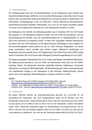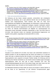 lebensbedrohliche Haftbedingungen; willkürliche Verhaftung oder Inhaftierung; politische Gefangene oder Häftlinge; politisch motivierte Repressalien gegen Personen in einem anderen Land; ernsthafte Probleme mit der Unabhängigkeit der Justiz (USDOS 12.4.2022). Die Verfassung sieht Rede- und Pressefreiheit vor (USDOS 12.4.2022; vgl. FH 24.2.2022), diese Rechte werden in der Praxis jedoch stark eingeschränkt (FH 24.2.2022). Verboten sind "verleumderische" Äußerungen über den Präsidenten und andere hochrangige Beamte; Material, das als Gefährdung der nationalen Sicherheit gilt; sowie rassistische oder ethnische Hassreden. Zusätzliche Beschränkungen, die 2015 eingeführt wurden, gelten weiterhin und werden auf alle Presseorgane angewandt. Journalisten und freimütige Kritiker berichteten über Schikanen und Einschüchterungen durch Sicherheitsdienste und Regierungsbeamte, die sie daran hindern, ihre Arbeit unabhängig zu verrichten oder über sensible Themen zu berichten (USDOS 12.4.2022). Medienschaffende riskieren Drohungen, Belästigungen und Verhaftungen als Reaktion auf ihre Berichterstattung (FH 24.2.2022). Die Regierung schränkt die Versammlungs- und Vereinigungsfreiheit ein. Die Verfassung sieht die Freiheit vor, sich friedlich zu versammeln, aber die Regierung respektiert dieses Recht nicht immer. Das Gesetz schreibt vor, dass politische Parteien und große Gruppen eine öffentliche Versammlung im Voraus und eine geplante Demonstration mindestens vier Tage vorher bei der Regierung anmelden müssen (USDOS 12.4.2022). Oppositionelle oder regierungsfeindliche Versammlungen und Kundgebungen werden in der Regel verhindert oder aufgelöst, und die Teilnehmer werden schikaniert oder verhaftet (FH 24.2.2022). Die Verfassung sieht die Vereinigungsfreiheit im Rahmen der gesetzlichen Bestimmungen vor, doch die Regierung schränkt dieses Recht stark ein. Ein Gesetz, das internationale NGOs einschränkt, schreibt vor, dass diese einen Teil ihres Budgets bei der Bank der Republik Burundi hinterlegen müssen, und dass sie Pläne entwickeln und umsetzen müssen, um bei der Einstellung von einheimischem Personal ein ausgewogenes Verhältnis von Ethnie und Geschlecht zu erreichen (USDOS 12.4.2022). Zudem sind NGOs mit restriktiven Registrierungsgesetzen und der Verfolgung von Aktivitäten konfrontiert, die als regierungsfeindlich angesehen werden. Menschenrechtsverteidiger können verhaftet und inhaftiert werden (FH 24.2.2022). Quellen: -FH - Freedom House (24.2.2022): Freedom in the World 2022 - Burundi, https://www.ecoi.net/de/dokument/2071858.html, Zugriff 22.11.2022 - HRW - Human Rights Watch (13.1.2022): World Report 2022 - Burundi, https://www.ecoi.net/de/dokument/2066546.html, Zugriff 23.11.2022 -USDOS - U.S. Department of State [USA] (12.4.2022): Country Report on Human Rights Practices 2021 - Burundi, https://www.ecoi.net/de/dokument/2071151.html, Zugriff 22.11.2022 .BFA Bundesamt für Fremdenwesen und Asyl Seite 12 von 19