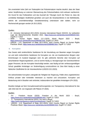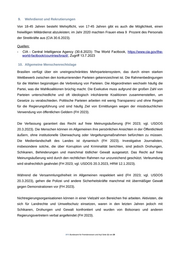 Die unverändert hohe Zahl von Todesopfern bei Polizeieinsätzen machte deutlich, dass der Staat seiner Verpflichtung zur externen Überwachung des Polizeiverhaltens nicht wirksam nachkommt. Ein Grund für das Fortbestehen und das Ausmaß der Tötungen durch die Polizei ist, dass die unmittelbar Beteiligten Straffreiheit genießen und auch die Verantwortlichen in der Befehlskette, welche die unverhältnismäßige Gewaltanwendung unterstützen oder dulden, nicht zur Rechenschaft gezogen werden (AI 28.3.2023). Quellen: -AI - Amnesty International (28.3.2023): Amnesty International Report 2022/23; Zur weltweiten Lage der Menschenrechte; Brasilien 2022, https://www.ecoi.net/de/dokument/2089425.html, Zugriff 17.7.2023 -HRW - Human Rights Watch (12.1.2023): World Report 2023 – Brazil, https://www.ecoi.net/de/dokument/2085394.html, Zugriff 13.7.2023 - USDOS - U.S. Department of State (20.3.2023): 2022 Country Report on Human Rights Practices: Brazil, https://www.ecoi.net/de/dokument/2089460.html, Zugriff 13.7.2023 8. Korruption Das Gesetz sieht strafrechtliche Sanktionen für die Verurteilung von Beamten wegen Korruption vor und sieht zivilrechtliche Sanktionen für Korruption vor, die von brasilianischen Bürgern oder Einrichtungen im Ausland begangen wird. Es gibt zahlreiche Berichte über Korruption auf verschiedenen Regierungsebenen, und es kommt häufig zu Verzögerungen bei Gerichtsverfahren gegen Personen, die der Korruption beschuldigt werden, was häufig auf den verfassungsmäßigen Schutz gewählter Amtsträger vor Strafverfolgung zurückzuführen ist. Dies führt häufig zu einer faktischen Straffreiheit für die Verantwortlichen (USDOS 20.3.2023). Die weitverbreitete Korruption untergräbt die Fähigkeit der Regierung, Politik ohne ungebührlichen Einfluss privater oder krimineller Interessen zu machen und umzusetzen. Korruption und Bestechung sind in Brasilien weit verbreitet, insbesondere bei gewählten Amtsträgern (FH 2023). Brasilien belegte auf dem Korruptionswahrnehmungsindex von Transparency International für das Jahr 2022 den 94. von insgesamt 180 Plätzen (TI 2023). Quellen: -FH - Freedom House (2023): Freedom in the World 2023 - Brazil, https://www.ecoi.net/de/dokument/2088496.html, Zugirff 12.7.2023 - TI - Transparency International (2023): Our work in Brazil, https://www.transparency.org/en/countries/brazil, Zugriff 13.7.2023 - USDOS - U.S. Department of State (20.3.2023): 2022 Country Report on Human Rights Practices: Brazil, https://www.ecoi.net/de/dokument/2089460.html, Zugriff 13.7.2023 .BFA Bundesamt für Fremdenwesen und Asyl Seite 10 von 20
