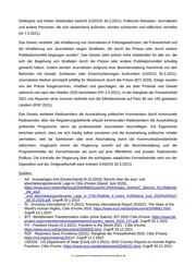 Gefängnis und hohen Geldstrafen bedroht (USDOS 30.3.2021). Politische Aktivisten, Journalisten und andere Personen, die sich abweichend äußerten, wurden schikaniert und willkürlich verhaftet (AI 7.4.2021). Das Gesetz verbietet „die Inhaftierung von Journalisten in Polizeigewahrsam, die Präventivhaft und die Inhaftierung von Journalisten wegen Straftaten, die durch die Presse oder durch andere Publikationsmittel begangen wurden“. Das Gesetz sieht jedoch hohe Geldstrafen für alle vor, die sich der Begehung von Straftaten durch die Presse oder andere Publikationsmittel schuldig gemacht haben. Zudem werden Journalisten aufgrund ihrer Berichterstattung manchmal von den Behörden mit Gewalt, Schikanen oder Einschüchterungen konfrontiert (USDOS 30.3.2021). Journalisten bleiben prinzipiell anfällig für Missbrauch durch die Polizei (BTI 2020). Einige wurden von der Polizei festgenommen, inhaftiert und geschlagen, als sie über Proteste und Gewalt während und nach den Wahlen 2020 berichteten (FH 3.3.2021). In der Rangliste der Pressefreiheit 2021 von Reporter ohne Grenzen befindet sich die Elfenbeinküste auf Platz 66 von 180 gelisteten Ländern (RSF 2021). Das Gesetz verbietet Radiosendern die Ausstrahlung politischer Kommentare durch kommunale Radiosender, aber die Regulierungsbehörde erlaubt kommunalen Radiosendern die Ausstrahlung politischer Programme, wenn sie professionelle Journalisten beschäftigen. Die Eigentümer berichten jedoch, dass sie sich häufig selbst zensieren und die Ausstrahlung politischer Inhalte vermeiden, weil sie Sanktionen oder eine Abschaltung durch die Kommunikationsbehörde befürchten. Insgesamt nimmt die Regierung sowohl auf die Berichterstattung und die Programminhalte der Fernsehsender als auch auf jene öffentlicher und privater Radiosender Einfluss. Die Kontrolle der Regierung über die wichtigsten staatlichen Fernsehsender wird von der Opposition und der Zivilgesellschaft stark kritisiert (USDOS 30.3.2021). Quellen: - AA - Auswärtiges Amt [Deutschland] (9.10.2020): Bericht über die asyl- und abschiebungsrelevante Lage in Côte d‘Ivoire (Stand: Juni 2020), https://www.ecoi.net/en/file/local/2040690/Ausw%C3%A4rtiges_Amt%2C_Bericht_%C3%Bcber _die_asyl- _und_abschiebungsrelevante_Lage_in_C%C3%B4te_d_Ivoire_%28Stand_Juni_2020%29%2C _09.10.2020.pdf, Zugriff 20.1.2022 - AI - Amnesty International (7.4.2021): Amnesty International Report 2020/21; The State of the World's Human Rights; Côte d'Ivoire 2020, https://www.ecoi.net/de/dokument/2048661.html, Zugriff 13.1.2022 - BTI - Bertelsmann Transformation Index (ohne Datum): BTI 2020 Côte d'Ivoire, https://www.bti- project.org/content/en/downloads/reports/country_report_2020_CIV.pdf, Zugriff 20.1.2022 - FH - Freedom House (3.3.2021): Freedom in the World 2021 - Côte d'Ivoire, https://www.ecoi.net/de/dokument/2046505.html, Zugriff 29.12.2021 - RSF - Reporters Sans Frontières (2021): Rangliste der Pressefreiheit 2020, Côte d’Ivoire, https://rsf.org/en/ranking/2021#, Zugriff 12.1.2022 - USDOS - US Department of State [USA] (30.3.2021): 2020 Country Reports on Human Rights Practices: Côte d’Ivoire, https://www.ecoi.net/de/dokument/2048151.html, Zugriff 30.12.2021 .BFA Bundesamt für Fremdenwesen und Asyl Seite 18 von 34