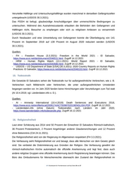 Quellen: - FH – Freedom House (3.3.2021): Freedom in the World 2021 - El Salvador, https://www.ecoi.net/de/dokument/2046511.html, Zugriff 14.12.2021 - HRW – Human Rights Watch (13.1.2021): World Report 2021 - El Salvador, https://www.ecoi.net/de/dokument/2043580.html, Zugriff 14.12.2021 - USDOS – US Department of State [USA] (30.3.2021): 2020 Country Reports on Human Rights Practices: El Salvador, https://www.ecoi.net/de/dokument/2048153.html, Zugriff 10.12.2021 7. Folter und unmenschliche Behandlung In der Vergangenheit haben die Sicherheitskräfte außergerichtliche Hinrichtungen, sexuelle Übergriffe, gewaltsames Verschwindenlassen und Folter begangen (HRW 13.1.2021). Das Gesetz verbietet solche Praktiken, aber es gab Berichte über Verstöße (USDOS 30.3.2021). Quellen: - HRW – Human Rights Watch (13.1.2021): World Report 2021 - El Salvador, https://www.ecoi.net/de/dokument/2043580.html, Zugriff 16.12.2021 - USDOS – US Department of State [USA] (30.3.2021): 2020 Country Reports on Human Rights Practices: El Salvador, https://www.ecoi.net/de/dokument/2048153.html, Zugriff 10.12.2021 8. Korruption Das Gesetz sieht strafrechtliche Sanktionen für die Verurteilung von Beamten wegen Korruption vor. Obwohl der Oberste Gerichtshof die Korruption in der Exekutive und der Judikative untersuchte und einige Fälle zur möglichen Anklageerhebung an die FGR verwies, waren Korruption und Straffreiheit weiterhin weit verbreitet (USDOS 30.3.2021; vgl. FH 3.3.2021). Die Korruption im Justizsystem trug zu einem hohen Maß an Straflosigkeit bei und untergrub die Rechtsstaatlichkeit und das Ansehen der Justiz in der Öffentlichkeit. Zu den Anschuldigungen gegen Richter gehörten Absprachen mit kriminellen Elementen und sexuelle Belästigung (USDOS 30.3.2021). Nach dem Gesetz über unerlaubte Bereicherung sind ernannte und gewählte Beamte verpflichtet, ihr Vermögen bei der Abteilung für Rechtschaffenheit des Obersten Gerichtshofs offenzulegen. Das Gesetz sieht bescheidene Geldstrafen für die Nichteinhaltung vor. Die Erklärungen waren für die Öffentlichkeit nicht zugänglich, es sei denn, sie wurden auf Antrag abgegeben (USDOS 30.3.2021). Die weit verbreitete Korruption untergräbt die Demokratie und die Rechtsstaatlichkeit (FH 3.3.2021; vgl. BTI 2020). Der Corruption Perceptions Index 2020 von Transparency International listet El Salvador auf Platz 104 von 180 Staaten auf (TI ohne Datum). Quellen: - BTI – Bertelsmann Transformations Index (2020): BTI 2020 Coutry Report, El Salvador, https://bti-project.org/fileadmin/api/content/en/downloads/reports/country_report_2020_SLV.pdf, Zugriff 16.12.2021 .BFA Bundesamt für Fremdenwesen und Asyl Seite 13 von 27