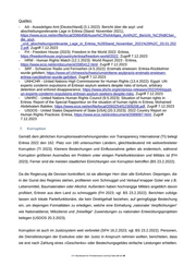 Quellen: - AA - Auswärtiges Amt [Deutschland] (3.1.2022): Bericht über die asyl- und abschiebungsrelevante Lage in Eritrea (Stand: November 2021), https://www.ecoi.net/en/file/local/2066458/Ausw%C3%A4rtiges_Amt%2C_Bericht_%C3%BCber_ die_asyl- _und_abschiebungsrelevante_Lage_in_Eritrea_%28Stand_November_2021%29%2C_03.01.202 2.pdf, Zugriff 7.12.2023 - FH - Freedom House (2023): Freedom in the World 2022: Eritrea, https://freedomhouse.org/country/eritrea/freedom-world/2022, Zugriff 7.12.2023 - HRW - Human Rights Watch (12.1.2023): World Report 2023 - Eritrea, https://www.ecoi.net/en/document/2085412.html, Zugriff 7.12.2023 - SRF - Schweizer Radio und Fernsehen (4.5.2022): Erstmals erwiesen: Eritrea-Rückkehrer wurde gefoltert, https://www.srf.ch/news/schweiz/umstrittene-asylpraxis-erstmals-erwiesen- eritrea-rueckkehrer-wurde-gefoltert, Zugriff 7.12.2023 - UNHCHR - United Nations High Commissioner for Human Rights (13.4.2022): Egypt: UN experts condemn expulsions of Eritrean asylum seekers despite risks of torture, arbitrary detention and enfored disappearance, https://www.ohchr.org/en/press-releases/2022/04/egypt- un-experts-condemn-expulsions-eritrean-asylum-seekers-despite-risks, Zugriff 7.12.2023 - UNHRC - United Nations Human Rights Council (9.5.2023): Situation of human rights in Eritrea. Report of the Special Rapporteur on the situation of human rights in Eritrea, Mohamed Abdelsalam Babiker, https://www.ecoi.net/en/file/local/2093254/G2309208.pdf, Zugriff 7.12.2023 - USDOS - United States Department of State [USA] (20.3.2023): 2022 Country Report on Human Rights Practices: Eritrea, https://www.ecoi.net/en/document/2089067.html, Zugriff 7.12.2023 7. Korruption Gemäß dem jährlichen Korruptionswahrnehmungsindex von Transparency International (TI) belegt Eritrea 2022 den 162. Platz von 180 untersuchten Ländern, gleichbedeutend mit weitverbreiteter Korruption (TI 2023). Kleinere Bestechungen und Einflussnahme gelten als endemisch, während Korruption größeren Ausmaßes ein Problem unter einigen Parteifunktionären und Militärs ist (FH 2023). Ferner sind die meisten staatlichen Einrichtungen von Korruption betroffen (BS 23.2.2022). Da die Regierung die Devisen kontrolliert, ist sie alleiniger Herr über alle Einfuhren. Diejenigen, die in der Gunst des Regimes stehen, profitieren vom Schmuggel und Verkauf knapper Güter wie z.B. Lebensmittel, Baumaterialien oder Alkohol. Außerdem haben hochrangige Militärs angeblich davon profitiert, Eritreer aus dem Land zu schmuggeln (FH 2023; vgl. BS 23.2.2022). Berichten zufolge lassen sich lokale Parteifunktionäre, die kein Direktgehalt beziehen, auf geringfügige Bestechung ein, um diejenigen Formalitäten zu erledigen, welche eine Einhaltung „nationaler Verpflichtungen“ wie Nationaldienst, Milizdienst und „freiwillige“ Zuwendungen zu nationalen Entwicklungsprojekten belegen (USDOS 20.3.2023). Korruption ist auch im Justizsystem weit verbreitet (SFH 16.2.2023; vgl. BS 23.2.2022). Personen, die Dienstleistungen der Exekutive oder der Justiz in Anspruch nehmen wollten, berichteten, dass sie erst nach Zahlung eines «Geschenks» oder Bestechungsgeldes einfache Leistungen erhielten. .BFA Bundesamt für Fremdenwesen und Asyl Seite 14 von 48