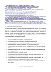 - FH - Freedom House (2023): Freedom in the World 2022: Eritrea, https://freedomhouse.org/country/eritrea/freedom-world/2022, Zugriff 11.12.2023 - GCR2P - Global Centre for the Responsibility to Protect (31.8.2023): Eritrea, https://www.globalr2p.org/countries/eritrea/, Zugriff 11.12.2023 - HO - Home Office [Vereinigtes Königreich] (9.2021): Country Policy and Information Note. Eritrea: National service and illegal exit, https://assets.publishing.service.gov.uk/media/614dec63d3bf7f7192d4bf0f/ ERI_CPIN_National_service_and_illegal_exit.pdf, Zugriff 11.12.2023 - HRW - Human Rights Watch (12.1.2023): World Report 2023 - Eritrea, https://www.ecoi.net/en/document/2085412.html, Zugriff 11.12.2023 - SFH - Schweizerische Flüchtlingshilfe (25.8.2023): “Der Nationaldienst in seiner jetzigen Form ist untrennbar mit Zwangsarbeit und der Sklaverei ähnlichen Praktiken verbunden”, https://www.fluechtlingshilfe.ch/publikationen/news-und-stories/der-nationaldienst-in-seiner- jetzigen-form-ist-untrennbar-mit-zwangsarbeit-und-der-sklaverei-aehnlichen-praktiken-verbunden, Zugriff 11.12.2023 - UNHRC - United Nations Human Rights Council (9.5.2023): Situation of human rights in Eritrea. Report of the Special Rapporteur on the situation of human rights in Eritrea, Mohamed Abdelsalam Babiker, https://www.ecoi.net/en/file/local/2093254/G2309208.pdf, Zugriff 11.12.2023 10. Allgemeine Menschenrechtslage In Eritrea kann es fallweise zu massiven Menschenrechtsverletzungen kommen, und in den letzten Jahren hat sich das nicht signifikant geändert. In der 1997 angenommenen Verfassung, welche bis heute nicht in Kraft getreten ist, sind in Art. 14 bis 24 die Grundrechte niedergelegt. Sie werden von staatlichen Organen allerdings nicht respektiert (AA 3.1.2022) - es gibt in Eritrea überhaupt keinen Schutz der Bürgerrechte (BS 23.2.2022). Folgende UN-Menschenrechtskonventionen respektive Fakultativprotokolle hat Asmara jedoch ratifiziert: •Internationaler Pakt über bürgerliche und politische Rechte •Internationaler Pakt über wirtschaftliche, soziale und kulturelle Rechte •Internationales Übereinkommen zur Beseitigung jeder Form von Rassendiskriminierung •Übereinkommen zur Beseitigung jeder Form von Diskriminierung der Frau •Fakultativprotokoll zum Übereinkommen zur Beseitigung jeder Form von Diskriminierung der Frau •Übereinkommen gegen Folter und andere grausame, unmenschliche oder erniedrigende Behandlung oder Strafe •Übereinkommen über die Rechte des Kindes •Fakultativprotokoll zum Übereinkommen über die Rechte des Kindes betreffend die Beteiligung von Kindern an bewaffneten Konflikten •Fakultativprotokoll zum Übereinkommen über die Rechte des Kindes betreffend den Verkauf von Kindern, die Kinderprostitution und die Kinderpornographie •Internationales Übereinkommen zum Schutz aller Personen vor dem Verschwindenlassen (AA 3.1.2022) .BFA Bundesamt für Fremdenwesen und Asyl Seite 19 von 48