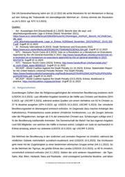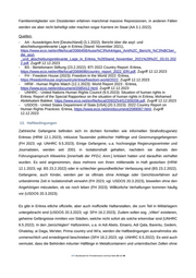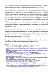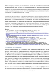 Eritrea verweigert grundsätzlich jede Zusammenarbeit mit UN- oder AU-Mechanismen im Bereich der Menschenrechte (HRW 12.1.2023). Ein Sonderberichterstatter zur Menschenrechtssituation in Eritrea wird seit 2012 vom UN-Menschenrechtsrat bestellt (AA 3.1.2022), wobei ihm eine Einreise von der eritreischen Regierung verwehrt wird (HRW 12.1.2023). Mohammed Abdelsalam Babiker übernahm das Amt im September 2020 (AA 3.1.2022). In seinem bis dato letzten Bericht an den UN-Menschenrechtsrat vom 9.5.2023 beschreibt er die Menschenrechtssituation in Eritrea mit Schwerpunkten auf der unbefristeten Wehrpflicht samt ihren Auswirkungen auf sozioökonomische sowie kulturelle Rechte, den Zustand der Rechtsstaatlichkeit und der Justizverwaltung, und Verletzungen der Bürgerrechte, einschließlich lang andauernder und willkürlicher Inhaftierungen wie gewaltsames Verschwindenlassen. Überdies hebt er die Situation indigener Afar-Gemeinschaften in Eritrea hervor, die nach wie vor Diskriminierung, Verfolgung und Eingriffen in ihre traditionellen Lebensgrundlagen ausgesetzt sind (UNHRC 9.5.2023). Quellen: - AA - Auswärtiges Amt [Deutschland] (3.1.2022): Bericht über die asyl- und abschiebungsrelevante Lage in Eritrea (Stand: November 2021), https://www.ecoi.net/en/file/local/2066458/Ausw%C3%A4rtiges_Amt%2C_Bericht_%C3%BCber_ die_asyl- _und_abschiebungsrelevante_Lage_in_Eritrea_%28Stand_November_2021%29%2C_03.01.202 2.pdf, Zugriff 22.12.2023 - BS - Bertelsmann Stiftung (23.2.2022): BTI 2022 Country Report: Eritrea, https://www.ecoi.net/en/file/local/2069696/country_report_2022_ERI.pdf, Zugriff 22.12.2023 - HRW - Human Rights Watch (12.1.2023): World Report 2023 - Eritrea, https://www.ecoi.net/en/document/2085412.html, Zugriff 22.12.2023 - UNHRC - United Nations Human Rights Council (9.5.2023): Situation of human rights in Eritrea. Report of the Special Rapporteur on the situation of human rights in Eritrea, Mohamed Abdelsalam Babiker, https://www.ecoi.net/en/file/local/2093254/G2309208.pdf, Zugriff 22.12.2023 11. Meinungs- und Pressefreiheit Meinungs- und Pressefreiheit sind in Eritrea noch immer nicht existent (UNHRC 9.5.2023; vgl. AA 3.1.2022; BS 23.2.2022) bzw. erheblich eingeschränkt (USDOS 20.3.2023; vgl. HRW 12.1.2023). Die Regierung begrenzt mittels Einschüchterungen durch die Sicherheitsorgane alle Möglichkeiten, sie öffentlich oder privat zu kritisieren (USDOS 20.3.2023). Freie Meinungsäußerungen und private Diskussionen werden durch die Angst vor Regierungsinformanten und die Wahrscheinlichkeit, bei jeder Äußerung einer abweichenden Meinung willkürlich verhaftet zu werden, stark beeinträchtigt (FH 2023; vgl. BS 23.2.2022), vor allem da die Überwachung permanent wie omnipräsent ist (RSF 2023a). Zwar gewährleistet die Verfassung von 1997 die Meinungs- sowie Pressefreiheit pro forma (RSF 2023a; vgl. USDOS 20.3.2023), aber sie ist immer noch nicht in Kraft getreten (AA 3.1.2022). Eine freie Presse existiert im Land nicht (AA 3.1.2022). Reporter ohne Grenzen (RSF) beschreibt die Regimekontrolle über Nachrichten und Informationen als total bzw. totalitär (RSF 2023a). In der .BFA Bundesamt für Fremdenwesen und Asyl Seite 20 von 48
