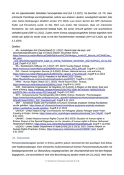 die mit oppositionellen Aktivitäten hervorgetreten sind (AA 3.1.2022). So berichtet z.B. FH, dass eritreische Flüchtlinge und Asylbewerber, welche aus anderen Ländern zurückgeführt werden, teils unter harten Bedingungen inhaftiert werden (FH 2023). Laut einem Bericht des SRF (Schweizer Radio und Fernsehen) wurde im Mai 2022 zum ersten Mal bewiesen, dass ein eritreischer Rückkehrer, der sich oppositionell betätigt hatte, bei seiner Ankunft gefoltert und anschließend verhaftet wurde (SRF 4.5.2022). Zudem nimmt Eritrea zwangsrückgeführte Eritreer eigentlich nicht wieder auf, außer es wurde vorab so mit den Rückkehrenden vereinbart (SFH 19.9.2020; vgl. DIS 3.2.2020). Quellen: - AA - Auswärtiges Amt [Deutschland] (3.1.2022): Bericht über die asyl- und abschiebungsrelevante Lage in Eritrea (Stand: November 2021), https://www.ecoi.net/en/file/local/2066458/Ausw%C3%A4rtiges_Amt%2C_Bericht_%C3%BCber_ die_asyl- _und_abschiebungsrelevante_Lage_in_Eritrea_%28Stand_November_2021%29%2C_03.01.202 2.pdf, Zugriff 4.12.2023 - BS - Bertelsmann Stiftung (23.2.2022): BTI 2022 Country Report: Eritrea, https://www.ecoi.net/en/file/local/2069696/country_report_2022_ERI.pdf, Zugriff 4.12.2023 - DIS - Danish Immigration Service (3.2.2020): Eritrea. National service, exit and entry, https://www.ecoi.net/en/file/local/2024189/Eritrea_rapport_27012020.pdf, Zugriff 4.12.2023 - FH - Freedom House (2023): Freedom in the World 2022: Eritrea, https://freedomhouse.org/country/eritrea/freedom-world/2022, Zugriff 4.12.2023 - HRW - Human Rights Watch (12.1.2023): World Report 2023 - Eritrea, https://www.ecoi.net/en/document/2085412.html, Zugriff 4.12.2023 - IOM - International Organization for Migration (25.9.2023): A Region on the Move: East and Horn of Africa, https://reliefweb.int/attachments/5c9a7002-b58b-4b7d-81e4-7d6562929cc5/ pub2023-044-r-on-the-move-2022-eha.pdf, Zugriff 4.12.2023 - SFH - Schweizerische Flüchtlingshilfe (19.9.2020): Eritrea: Rückkehr. Themenpapier, https://www.fluechtlingshilfe.ch/fileadmin/user_upload/Publikationen/Herkunftslaenderberichte/ Afrika/Eritrea/200919_ERI_Rueckkehr.pdf, Zugriff 4.12.2023 - SRF - Schweizer Radio und Fernsehen (4.5.2022): Erstmals erwiesen: Eritrea-Rückkehrer wurde gefoltert, https://www.srf.ch/news/schweiz/umstrittene-asylpraxis-erstmals-erwiesen- eritrea-rueckkehrer-wurde-gefoltert, Zugriff 4.12.2023 - UNHCR - United Nations High Commissioner for Refugees (2023): Refugee Data Finder. Country of Origin: Eritrea, https://www.unhcr.org/refugee-statistics/download/?url=7Myi9P, Zugriff 4.12.2023 - UNHRC - United Nations Human Rights Council (9.5.2023): Situation of human rights in Eritrea. Report of the Special Rapporteur on the situation of human rights in Eritrea, Mohamed Abdelsalam Babiker, https://www.ecoi.net/en/file/local/2093254/G2309208.pdf, Zugriff 4.12.2023 - USDOS - United States Department of State [USA] (20.3.2023): 2022 Country Report on Human Rights Practices: Eritrea, https://www.ecoi.net/en/document/2089067.html, Zugriff 4.12.2023 23. Dokumente Personenstandsregister werden in Eritrea geführt, jedoch dezentral bei den jeweiligen Sub-Zobas oder Stadtverwaltungen. Dem eritreischen Außenministerium können Personenstandsurkunden mit Bestätigungsvermerk zur Überprüfung vorgelegt werden; der Urkundeninhalt wird mit dem Register abgeglichen, und anschließend wird eine Bescheinigung darüber erteilt (AA 3.1.2022). Weil diese .BFA Bundesamt für Fremdenwesen und Asyl Seite 47 von 48