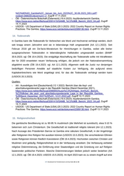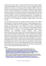 christliche Kirche in Bakau, welche zu Verletzten führte (BAMF 30.6.2023). Aufgrund kultureller und geschlechtsspezifischer Normen müssen Frauen in der Regel zur Religion ihres Mannes konvertieren und alle Kinder in der Religion ihres Mannes aufziehen (USDOS 15.5.2023). Der Staat hat sowohl muslimische als auch christliche Feiertage zu staatlichen Feiertagen erklärt (AA 12.1.2023). Christliche Kirchenarbeit wird nicht behindert und ist öffentlich sichtbar. Religiöse Gruppen, die weniger als 1 % der Bevölkerung ausmachen, sind Ahmadi Muslime, Baha’is, Hindus und Eckankar Mitglieder oder Gemeinden, die Mischformen von indigenen Glauben und Islam und Christentum praktizieren. Muslime der Ahmadiyya-Gemeinschaft sind von Festlichkeiten der übrigen Muslime ausgeschlossen, und durch eine Fatwa des Obersten Islamischen Rates aus dem Jahr 2015 wird u.a. die Beerdigung auf muslimischen Friedhöfen weiterhin verwehrt (ÖB 19.4.2023). Seit dem Regierungswechsel 2016 bzw. Anfang 2017 liegen keine Berichte über staatliche Einschränkungen der muslimischen Ahmadiyya-Gemeinde in Glaubensangelegenheiten oder in ihrer gesellschaftlichen Teilhabe bzw. ihrem Sozialengagement vor. Zudem verpflichtete sich die Regierung von Präsident Barrow in ihrem Weißbuch vom 25.5.2022 zur Umsetzung der Handlungsempfehlungen der TRRC u.a. dazu, den einflussreichen und quasi-staatlichen Obersten Islamische Rat (GSIC) zu reformieren, sowie Strafverfolgungsmaßnahmen gegen Personen einschließlich des Altpräsidenten Jammeh einzuleiten, denen schwere Menschenrechtsverletzungen gegen Angehörige der Ahmadiyya-Glaubensgemeinschaft angelastet werden. Sheriff Abba Sanyang, derzeitiger Minister für Land, Lokalverwaltung und religiöse Angelegenheiten, erklärte Mitte 2022, dass Ahmadiyya-Glaubensangehörigen die gleichen Rechte zustehen wie anderen Bürgerinnen und Bürgern des Landes. Staatspräsident Barrow und der stellvertretende Parlamentssprecher würdigten zuletzt das starke Engagement der Ahmadiyya- Glaubensgemeinschaft in Gambia, vor allem im Bereich der Bildung und Gesundheitsversorgung. Die Ahmadiyya-Gemeinde betreibt in Gambia Schulen und ein Krankenhaus. Dennoch geht aus Erkenntnisquellen hervor, dass auch nach Regierungsübernahme Barrows Diskriminierungen gegen Ahmadiyya-Glaubensangehörige bestehen bleiben. Der GSIC hat die Ahmadiyya weiterhin nicht in die muslimische Gemeinschaft integriert (BAMF 6.2023). Quellen: - AA - Auswärtiges Amt [Deutschland] (12.1.2022): Bericht über die Asyl- und abschiebungsrelevante Lage in der Republik Gambia (Stand Dezember 2021), https://www.ecoi.net/en/file/local/2066840/Ausw%C3%A4rtiges_Amt%2C_Bericht_ %C3%Bcber_die_asyl-_und_abschiebungsrelevante_Lage_in_der_Republik_Gambia_ %28Stand_Dezember_2021%29%2C_12.01.2022.pdf, Zugriff 10.11.2023 - BAMF - Bundesamt für Migration und Flüchtlinge [Deutschland] (30.6.2023): Briefing Notes Zusammenfassung Gambia, Kurzüberblick zu aktuellen Entwicklungen (Jänner bis Juni 2023), https://milo.bamf.de/OTCS/cs.exe/fetchcsui/-28833665/Deutschland._Bundesamt_f %C3%Bcr_Migration_und_Fl%C3%Bcchtlinge%2C_Briefing_Notes_Zusammenfassung_ .BFA Bundesamt für Fremdenwesen und Asyl Seite 20 von 34