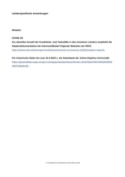 Länderspezifische Anmerkungen Hinweis: COVID-19: Zur aktuellen Anzahl der Krankheits- und Todesfälle in den einzelnen Ländern empfiehlt die Staatendokumentation bei Interesse/Bedarf folgende Websites der WHO: https://www.who.int/emergencies/diseases/novel-coronavirus-2019/situation-reports. Für historische Daten bis zum 10.3.2023 s. die Datenbank der Johns-Hopkins-Universität: https://gisanddata.maps.arcgis.com/apps/opsdashboard/index.html#/bda7594740fd4029942 3467b48e9ecf6 . .BFA Bundesamt für Fremdenwesen und Asyl Seite 3 von 34
