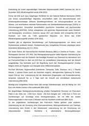 Familienzusammenführung; Medizinische und Psychosoziale Unterstützung und Unterstützung im Zusammenhang mit Wohnen und Haushalt (Einrichtung) (BMI 2023). Minderjährige haben die Möglichkeit die Einrichtung des ‚Social Welfare Service‘ in Anspruch zu nehmen, in der vor allem junge Kinder untergebracht werden können (AA 12.1.2022). Quellen: - AA - Auswärtiges Amt [Deutschland] (12.1.2022): Bericht über die Asyl- und abschiebungsrelevante Lage in der Republik Gambia (Stand Dezember 2021), https://www.ecoi.net/en/file/local/2066840/Ausw%C3%A4rtiges_Amt%2C_Bericht_ %C3%Bcber_die_asyl-_und_abschiebungsrelevante_Lage_in_der_Republik_Gambia_ %28Stand_Dezember_2021%29%2C_12.01.2022.pdf, Zugriff 10.11.2023 - BMI - Bundesministerium für Inneres [Österreich] (2023): Bundesagentur für Betreuungs- und Unterstützungsleistungen (BBU GmbH) - Guinea - So funktioniert die Rückreise in Ihre Heimat, https://www.returnfromaustria.at/gambia/gambia_deutsch.html, Zugriff 16.11.2023 - IHD - Integral Human Development (6.2022): Migration Profile The Gambia, https://migrants- refugees.va/country-profile/the-gambia/, Zugriff 3.11.2022 - IOM (2022): Interim Country Strategy IOM The Gambia 2022-2023, https://gambia.iom.int/sites/g/files/tmzbdl1631/files/documents/IOM%20The%20Gambia %20Interim%20Country%20Strategy%202022-2023.pdf, Zugriff 17.11.2023 - ÖB - Österreichische Botschaft [Österreich] (19.4.2023): Asylländerbericht Gambia, https://www.ecoi.net/en/file/local/2091415/GAMB_%C3%96B_Bericht_2023_04.pdf, Zugriff 14.11.2023 .BFA Bundesamt für Fremdenwesen und Asyl Seite 34 von 34