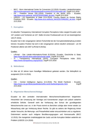 .BFA Bundesamt für Fremdenwesen und Asyl Seite 10 von 21 - BICC - Bonn International Center for Conversion (12.2015): Ecuador, Länderinformation, http://ruestungsexport.info/uploads/pdf/countries/201512/ecuador.pdf, Zugriff 23.5.2016 - FH - Freedom House (28.1.2015): Freedom in the World 2015 - Ecuador, http://www.ecoi.net/local_link/297553/433968_de.html, Zugriff 23.5.2016 - USDOS - US Department of State (13.4.2016): Country Report on Human Rights Practices 2015 - Ecuador, http://www.ecoi.net/local_link/322575/462052_de.html, Zugriff 23.5.2016 7. Korruption Im aktuellen Transparency International Corruption Perceptions Index rangiert Ecuador unter 167 Ländern und Territorien an 107. Stelle mit einer Punkteanzahl von 32 von bestmöglichen 100 (TI 2015). Ecuador hat in den vergangenen Jahren Fortschritte bei der Korruptionsbekämpfung erzielen können. Ecuadors Position hat sich in den vergangenen Jahren deutlich verbessert - um 40 Positionen alleine seit 2007 (LIPortal 9.2015a). Quellen: - LIPortal - Das Länder-Informations-Portal (9.2015a): Ecuador, Geschichte & Staat, https://www.liportal.de/ecuador/geschichte-staat/, Zugriff 23.5.2016 - TI - Transparency International (2015): Corruption Perceptions Index 2015; https://www.transparency.org/cpi2015/, Zugriff 23.5.2016 8. Wehrdienst Im Alter ab 18 Jahren kann freiwilliger Militärdienst geleistet werden. Die Wehrpflicht ist ausgesetzt (CIA 4.4.2016). Quellen: - CIA - Central Intelligence Agency (4.4.2016): The World Factbook - Ecuador, https://www.cia.gov/library/publications/the-world-factbook/geos/ec.html, Zugriff 23.5.2016 9. Allgemeine Menschenrechtslage Ecuador ist den zentralen internationalen Menschenrechtsabkommen beigetreten. Hinsichtlich der Umsetzung der Verträge und Konventionen zeigen sich jedoch weiterhin erhebliche Defizite. Generell sieht die Verfassung den Schutz der grundlegenden Menschenrechte zwar vor, in der Praxis kommt es Berichten zufolge aber immer wieder zur Missachtung oder gar Verletzung dieser Rechte. So gibt es seitens der Regierung immer wieder Versuche, die Meinungs- und Pressefreiheit weiter einzuschränken und zu regulieren. Diskriminiert werden auch indigene Bevölkerungsgruppen und Homosexuelle (BICC 12.2015). Die mangelnde Unabhängigkeit der Justiz und die Korruption bleiben weiterhin ein Problem (USDOS 13.4.2016).