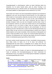 .BFA Bundesamt für Fremdenwesen und Asyl Seite 15 von 21 Vergewaltigungsopfer zu entkriminalisieren, stießen auf starken Widerstand seitens des Präsidenten, der mit seinem Rücktritt drohte, sollte ein solcher Vorschlag in der Nationalversammlung auch nur diskutiert werden. Der Vorschlag wurde zurückgezogen, und drei Kongressmitglieder der Regierungspartei wurden sanktioniert (AI 25.2.2015). Kinder werden mit 5-6 Jahren in die erste Grundschulklasse eingeschult. Die Grundschule ist obligatorisch, wenn auch nicht alle Kinder die Schule besuchen. Nur 76% schließen das fünfte Schuljahr ab. Es gibt staatliche, halbprivate und private Schulen. Die staatliche (fiscal) Schule ist kostenfrei. Grundschulen gibt es oft auch auf dem Lande (Großklassen mit verschiedenen Altersstufen). Nach sechs Jahren Grundschule folgt das Colegio mit denselben Schultypen. Hierfür muss aber eine Schulgebühr entrichtet werden. Kosten für das Schulmaterial, Uniformen und zumeist auch laufende Kosten für eine Extrabesoldung der Lehrkräfte (um sie in der Schule zu halten), sowie den Schulbus und Verpflegung kommen hinzu. Insofern ist bereits das Colegio für viele unerschwinglich. Nur 52% der Bevölkerung besuchen Sekundarschulen. Ecuador hat etwa 300 Bildungseinrichtungen des tertiären Sektors, die aber nicht alle vom Erziehungsministerium anerkannt sind. Es gibt 22 offizielle staatliche und 30 private Universitäten. Große Unterschiede im Bildungssektor sind sowohl im Stadt-Land-Gefälle als auch zwischen den einzelnen Bevölkerungsschichten zu verzeichnen. Das Bildungsniveau der Privatschulen liegt erheblich über dem der staatlichen Schulen. Die Alphabetisierungsrate liegt bei 86% (LIPortal 9.2015b). Das Gesetz verbietet sexuelle Ausbeutung von Kindern, einschließlich Kinderpornographie. Diese Delikte werden mit Strafen von 22 bis 26 Jahren Haft sanktioniert. Die Staatsbürgerschaft wird durch Geburt im Staatsgebiet und im Ausland, wenn einer der Elternteile die ecuadorianische Staatsbürgerschaft besitzt oder durch Einbürgerung, erlangt (USDOS 13.4.2016). Die Zahl der Frauenhäuser in Ecuador und damit die Unterbringungsmöglichkeiten von Frauen ist rudimentär. Eine Emanzipationsbewegung der Frauen, insbesondere der alleinstehenden Frauen, ist im Aufbau und mit mitteleuropäischen Maßstäben unvergleichbar und entwicklungsbedürftig (ÖB 6.6.2016). Quellen: - AI - Amnesty International (25.2.2015): Amnesty International Report 2014/15 - The State of the World's Human Rights - Ecuador, http://www.ecoi.net/local_link/297397/444519_de.html, Zugriff 23.5.2016 - BICC Bonn International Center for Conversion (12.2015): Ecuador, Länderinformation, http://ruestungsexport.info/uploads/pdf/countries/201512/ecuador.pdf, Zugriff 23.5.2016 - LIPortal - Das Länder-Informations-Portal (9.2015b): Ecuador, Gesellschaft, https://www.liportal.de/ecuador/gesellschaft/, Zugriff 23.5.2016