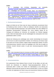 .BFA Bundesamt für Fremdenwesen und Asyl Seite 8 von 21 Quellen: - AA - Auswärtiges Amt (3.2016a): Staatsaufbau und Innenpolitik, http://www.auswaertiges-amt.de/DE/Aussenpolitik/Laender/Laenderinfos/Ecuador/ Innenpolitik_node.html, Zugriff 23.5.2016 - AA - Auswärtiges Amt (19.5.2016b): Ecuador: Reise- und Sicherheitshinweise, http://www.auswaertiges-amt.de/sid_3EA7DCDE839B095987A546F36169EFB3/DE/ Laenderinformationen/00-SiHi/Nodes/EcuadorSicherheit_node.html, Zugriff 23.5.2016 - BICC - Bonn International Center for Conversion (12.2015): Ecuador, Länderinformation, http://ruestungsexport.info/uploads/pdf/countries/201512/ecuador.pdf, Zugriff 23.5.2016 - EDA - Eidgenössisches Department für auswärtige Angelegenheiten (18.4.2016): Reisehinweise für Ecuador, https://www.eda.admin.ch/eda/de/home/vertretungen-und- reisehinweise/ecuador/reisehinweise-fuerecuador.html, Zugriff 23.5.2016 4. Rechtsschutz/Justizwesen Mängel und Defizite bei der Polizei sowie der daraus resultierende unzureichende Schutz der Bevölkerung führen vermehrt zu Fällen von Selbstjustiz. Betroffen sind insbesondere arme und indigene Bevölkerungsgruppen. Dazu gehört ebenfalls, dass vielen Häftlingen ein ordentliches Gerichtsverfahren vorenthalten wird. Ferner bestehen Defizite bei der Verfolgung und Aufklärung von Verbrechen, die mutmaßlich von Polizisten begangen wurden. Dabei wird häufig deutlich, dass die Unabhängigkeit des Justizsystems nicht immer gewährleistet ist (BICC 12.2015). Während die Verfassung eine unabhängige Justiz vorsieht, beeinträchtigen die Korruption und der Druck von außen die gerichtlichen Verfahren. Die Verfassung und Gesetze sorgen für das Recht auf ein faires Verfahren, obgleich häufig Verzögerungen auftreten. Es gilt die Unschuldsvermutung. Gesetzlich müssen die Angeklagten auch sofort über die gegen sie erhobenen Vorwürfe informiert werden. Es gibt keine Geschworenengerichte (USDOS 13.4.2016). Quellen: - BICC - Bonn International Center for Conversion (12.2015): Ecuador, Länderinformation, http://ruestungsexport.info/uploads/pdf/countries/201512/ecuador.pdf, Zugriff 23.5.2016 - USDOS - US Department of State (13.4.2016): Country Report on Human Rights Practices 2015 - Ecuador, http://www.ecoi.net/local_link/322575/462052_de.html, Zugriff 23.5.2016 5. Sicherheitsbehörden Die ecuadorianische Polizei (National Police) ist formell Teil des Militärs und steht unter Aufsicht des Ministeriums für allgemeine Regierungsangelegenheiten (Ministry of Government) (BICC 12.2015). Die Funktion der Nationalpolizei ist die Wahrung der öffentlichen Ordnung sowie die Garantie der internen Sicherheit (BICC 12.2015; vgl. USDOS 13.4.2016). Die Organisation der Polizei ist eng an die hierarchischen Strukturen des Militärs