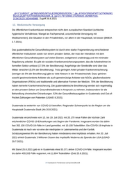 _gl=1*11d82n3*_ga*MjEzNDEzMTIzLjE2MjQ0NDU5ODU.*_ga_4YHGVSN5S4*MTYyOTk5MzM1 My4zLjAuMTYyOTk5MzM1My42MA..&_ga=2.179710948.174293020.1629987016- 213413123.1624445985, Zugriff 26.8.2021 13. Medizinische Versorgung Die öffentlichen Krankenhäuser entsprechen nicht dem europäischen Standard (schlechte hygienische Verhältnisse, Mangel an Fachpersonal, unzureichende Versorgung mit Medikamenten). Die Situation in den Privatkliniken, vor allem in der Hauptstadt, ist besser (BMEIA 2.7.2021). Das guatemaltekische Gesundheitssystem ist durch eine starke Fragmentierung verschiedener öffentlicher Institutionen sowie von einem privaten Sektor, der trotz der Interaktion mit dem öffentlichen Gesundheitssystem auf vielen Ebenen, weitgehend unabhängig und mit minimaler Regulierung arbeitet. Es gibt ein soziales Krankenversicherungssystem, das die Arbeitnehmer im formellen Sektor umfasst (17,5% der Bevölkerung). Angehörige der Streitkräfte sind über das Militär versichert (0,5% der Bevölkerung). Trotz geringem Anteil privater Krankenversicherung (weniger als 5% der Bevölkerung) gibt es viele Akteure in der Privatwirtschaft. Dazu gehören sowohl gewinnorientierte Anbieter als auch gemeinnützige Anbieter wie NGOs, glaubensbasierte Organisationen (FBOs) und traditionelle und alternative Formen der Medizin. 75% der Bevölkerung haben keinerlei Krankenversicherung. Die guatemaltekische Bevölkerung wendet sich regelmäßig an den privaten Sektor um Gesundheitsdienste in Anspruch zu nehmen, insbesondere für die Behandlung chronischer Erkrankungen. 52% der Gesundheitsausgaben in Guatemala sind Out-of- Pocket-Zahlungen von Patienten (USAID 8.2015). Guatemala ist weiterhin von COVID-19 betroffen. Regionaler Schwerpunkt ist die Region um die Hauptstadt Guatemala-Stadt (AA 20.8.2021). Guatemala verzeichnete vom 13. bis 19. Juli 2021 mit 20.170 neue Fällen die höchste Zahl wöchentlicher COVID-19-Erkrankungen seit Beginn der Pandemie. Insgesamt wurden bis dahin fast 352.100 COVID-19-Fälle im Land gemeldet, mit 10.100 Todesfällen. Die COVID-19-Impfrate in Guatemala ist nach wie vor eine der niedrigsten in Lateinamerika und der Karibik. Schätzungsweise 8% der Bevölkerung haben mindestens eine Impfdosis erhalten. Am 20. Juli 2021 erhielt Guatemala 3 Millionen Dosen des Impfstoffs Moderna als Spende der USA (USAID 29.7.2021). Mit Stand 25.8.2021 gab es in Guatemala etwa 53.371 aktive COVID-19-Fälle. Insgesamt wurden bis dahin 455.263 Fälle registriert, mit 11.694 Todesfällen (Gob 25.8.2021). .BFA Bundesamt für Fremdenwesen und Asyl Seite 19 von 20