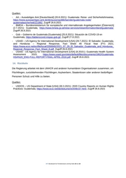 Quellen: - AA – Auswärtiges Amt [Deutschland] (20.8.2021): Guatemala: Reise- und Sicherheitshinweise, https://www.auswaertiges-amt.de/de/aussenpolitik/laender/guatemala-node/ guatemalasicherheit/221882, Zugriff 26.8.2021 - BMEIA – Bundesministerium für europäische und internaltionale Angelegenheiten [Österreich] (2.7.2021): Guatemala, https://www.bmeia.gv.at/reise-services/reiseinformation/land/guatemala/, Zugriff 26.8.2021 - Gob – Gobierno de Guatemala [Guatemala] (25.8.2021): Situación de COVID-19 en Guatemala, https://tablerocovid.mspas.gob.gt/, Zugriff 27.8.2021 - USAID – US Agency for International Development [USA] (29.7.2021): El Salvador, Guatemala, and Honduras – Regional Response, Fact Sheet #8 Fiscal Year (FY) 2021, https://www.ecoi.net/en/file/local/2056945/2021_07_29_El_Salvador_Guatemala_and_Honduras_ Regional_Response_Fact_Sheet_8.pdf, Zugriff 26.8.2021 - USAID - US Agency for International Development [USA] (8.2015:): Guatemala Health System Assessment 2015, https://www.usaid.gov/sites/default/files/documents/1862/Guatemala- HSA%20_ENG-FULL-REPORT-FINAL-APRIL-2016.pdf, Zugriff 26.8.2021 14. Rückkehr Die Regierung arbeitet mit dem UNHCR und anderen humanitären Organisationen zusammen, um Flüchtlingen, zurückkehrenden Flüchtlingen, Asylwerbern, Staatenlosen oder anderen bedürftigen Personen Schutz und Hilfe zu bieten. Quellen: - USDOS – US Department of State [USA] (30.3.2021): 2020 Country Reports on Human Rights Practices: Guatemala, https://www.ecoi.net/de/dokument/2048157.html, Zugriff 26.8.2021 .BFA Bundesamt für Fremdenwesen und Asyl Seite 20 von 20