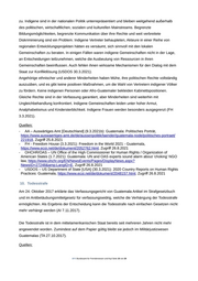 - AI – Amnesty International (7.11.2017): Guatemala: court decision ruling death penalty unconstitutional for most crimes is a key step on path to full abolition, https://www.amnesty.org/en/wp-content/uploads/2021/05/ACT5074122017ENGLISH.pdf, Zugriff 26.8.2021 - TA – Tagesanzeiger (27.10.2017): Guatemala schafft die Todesstrafe ab, https://www.tagesanzeiger.ch/ausland/amerika/guatemala-schafft-die-todesstrafe-ab/story/ 15234944, Zugriff 26.8.2021 11. Relevante Bevölkerungsgruppen 11.1. Frauen Das Gesetz kriminalisiert Vergewaltigung, einschließlich Vergewaltigung von Ehepartnern, und sieht Strafen zwischen fünf und 50 Jahren Gefängnis vor, aber die Regierung setzt das Gesetz nicht wirksam durch. Die Polizei verfügt nur über eine minimale Ausbildung zur Untersuchung von Sexualverbrechen oder um Opfern solcher Verbrechen zu helfen. Die Regierung unternahm Schritte zur Bekämpfung von Femizid und Gewalt gegen Frauen. Die Justiz unterhält weiterhin ein rund um die Uhr geöffnetes Gericht in Guatemala-Stadt, um Dienste im Zusammenhang mit Gewalt gegen Frauen anzubieten. Die Justiz unterhält auch im ganzen Land spezialisierte Gerichte für Gewalt gegen Frauen, jedoch nicht in allen Departements. Es gibt ein staatliches 24-Stunden- Opfer-Service-Center, um den Opfern medizinische, psychosoziale und rechtliche Unterstützung zu bieten, einschließlich einstweiliger Verfügungen zu ihrem sofortigen Schutz. Auch gibt es ein nationales Warnsystem für die Suche nach verschwundenen Frauen. Trotz dieser Fortschritte bleibt sexuelle Gewalt weit verbreitet. Von Januar bis August 2020 gab es 3.684 weibliche Opfer von Vergewaltigungen, verglichen mit 6.231 Frauen im Jahr davor. NGOs führen diesen Rückgang teilweise auf Schwierigkeiten beim Zugang zu den Behörden während der COVID-19-Pandemie zurück. Das Gesetz sieht Strafen für Frauenmorde von 25 bis 50 Jahren Gefängnis ohne die Möglichkeit einer Strafminderung vor; Femizid bleibt jedoch ein bedeutendes Problem. NGOs berichten, dass von Januar bis August 2020 302 Frauen getötet wurden, verglichen mit 477 im gleichen Zeitraum 2019. Von Januar bis November 2020 wurden 34 Personen wegen Femizids verurteilt. Gewalt gegen Frauen, einschließlich sexueller und häuslicher Gewalt, ist nach wie vor weit verbreitet und schwerwiegend. Das Gesetz sieht Strafen von fünf bis acht Jahren für körperliche, wirtschaftliche und psychische Gewalt gegen Frauen aufgrund ihres Geschlechts vor. Während der COVID-19-Pandemie gab es einen Anstieg von häuslicher Gewalt und Gewalt gegen Frauen. Obwohl sich mehrere Gesetze auf sexuelle Belästigung beziehen, wird sie in keinem einzigen Gesetz direkt angesprochen. Menschenrechtsorganisationen berichten, dass sexuelle Belästigung weit verbreitet ist. Obwohl das Gesetz den Grundsatz der Gleichstellung der Geschlechter festlegt, werden Frauen, insbesondere indigene Frauen, diskriminiert und sind seltener in Führungspositionen (USDOS 30.3.2021). .BFA Bundesamt für Fremdenwesen und Asyl Seite 16 von 20