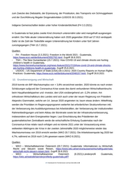 zum Zwecke des Diebstahls, der Erpressung, der Prostitution, des Transports von Schmuggelware und der Durchführung illegaler Drogenaktivitäten (USDOS 30.3.2021). Indigene Gemeinschaften leiden unter hoher Kindersterblichkeit (FH 3.3.2021). In Guatemala ist fast jedes zweite Kind chronisch unterernährt oder wird mangelhaft ausgewogen ernährt. Die Fälle akuter Unterernährung haben sich 2020 gegenüber 2019 auf 27.913 verdoppelt. Dafür ist die Zahl der Todesfälle wegen Unterernährung bei Kindern unter fünf Jahren zurückgegangen (TNH 15.7.2021). Quellen: - FH - Freedom House (3.3.2021): Freedom in the World 2021 - Guatemala, https://www.ecoi.net/de/dokument/2052762.html, Zugriff 26.8.2021 - TNH – The New Humanitarian (15.7.2021): How COVID-19 and climate shocks are hurting children’s health in Guatemala, https://www.thenewhumanitarian.org/news-feature/2021/7/15/how-covid-19-and-climate-shocks- are-hurting-childrens-health-in-guatemala, Zugriff 25.8.2021 - USDOS – US Department of State [USA] (30.3.2021): 2020 Country Reports on Human Rights Practices: Guatemala, https://www.ecoi.net/de/dokument/2048157.html, Zugriff 26.8.2021 12. Grundversorgung und Wirtschaft 2019 konnte ein BIP-Wachstumsplus von + 3,8% verzeichnet werden. 2020 könnte es nach ersten Schätzungen aufgrund der Coronavirus-Krise sowie des damit verbundenen Wirtschaftseinbruchs beim Haupthandelspartner und -investor, den USA vorübergehend um -2,2% sinken. Am orthodoxen Wirtschaftskurs des Landes wird sich auch unter der neuen Regierung von Präsident Alejandro Giammattei, welche am 14. Januar 2020 angetreten ist, kaum etwas ändern. Mittelfristig werden die Prioritäten im Regierungsprogramm weiterhin bei erforderlichen Strukturreformen inkl. der Verbesserung des Ausbildungsniveaus bei Arbeitskräften, der Verbesserung der institutionellen Rahmenbedingungen und beim Abbau der Bürokratie sowie bei der Infrastrukturverbesserung, insbesondere auf dem Energiesektor liegen. Laut Einschätzung des Präsidenten der guatemaltekischen Zentralbank werde die wirtschaftliche Erholung Guatemalas nach der Coronavirus-Krise relativ rasch erfolgen und es könnte 2021 unter der Voraussetzung eines weltweiten Abklingens der Krise in der zweiten Jahreshälfte 2020 möglicherweise wieder das Wachstumsniveau von 2019 erreicht werden (WKO 20.7.2021). Die Arbeitslosenquote lag 2020 bei 4,7%, während es 2019 noch 2,4% gewesen waren (WKO 8.2021). Quellen: - WKO – Wirtschaftskammer Österreich (20.7.2021): Guatemala: Informationen zu Wirtschaft, Recht und Steuern sowie Reisen, https://www.wko.at/service/aussenwirtschaft/guatemala- wirtschaft-recht-steuern-reisen.html, Zugriff 26.8.2021 - WKO – Wirtschaftskammer Österreich (8.2021):Länderprofil Guatemala, https://wko.at/statistik/laenderprofile/lp-guatemala.pdf? .BFA Bundesamt für Fremdenwesen und Asyl Seite 18 von 20