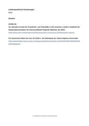 Länderspezifische Anmerkungen keine Hinweis: COVID-19: Zur aktuellen Anzahl der Krankheits- und Todesfälle in den einzelnen Ländern empfiehlt die Staatendokumentation bei Interesse/Bedarf folgende Websites der WHO: https://www.who.int/emergencies/diseases/novel-coronavirus-2019/situation-reports. Für historische Daten bis zum 10.3.2023 s. die Datenbank der Johns-Hopkins-Universität: https://gisanddata.maps.arcgis.com/apps/opsdashboard/index.html#/bda7594740fd4029942 3467b48e9ecf6 . .BFA Bundesamt für Fremdenwesen und Asyl Seite 3 von 33