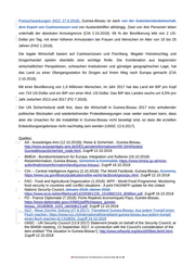 Preisschwankungen (NZZ 27.9.2018). Guinea-Bissau ist stark von der Subsistenzlandwirtschaft, dem Export von Cashewnüssen und von Auslandshilfen abhängig. Zwei von drei Personen leben unterhalb der absoluten Armutsgrenze (CIA 2.10.2018). 69 % der Bevölkerung lebt von 2 US- Dollar pro Tag, mit einer höheren Armutsrate n bei Frauen und Menschen im Alter von 15 bis 25 Jahren (FAO 1.2018). Die legale Wirtschaft basiert auf Cashewnüssen und Fischfang. Illegaler Holzeinschlag und Drogenhandel spielen ebenfalls eine wichtige Rolle. Die Kombination aus begrenzten wirtschaftlichen Perspektiven, schwachen Institutionen und günstiger geographischen Lage, hat das Land zu einer Übergangsstation für Drogen auf ihrem Weg nach Europa gemacht (CIA 2.10.2018). Mit einer Bevölkerung von 1,9 Millionen Menschen, im Jahr 2017 hat das Land ein BIP pro Kopf von 724 US-Dollar und ein BIP von einer Mrd. US-Dollar. Das BIP des Landes wuchs um 6,5% pro Jahr zwischen 2013 und 2017 (FD 7.2018). Der UN Sicherheitsrat stellt fest, dass die Wirtschaft in Guinea-Bissau 2017 trotz anhaltender politischer Blockaden und wiederkehrender Protestbewegungen zwar weiter wachsen kann, dass aber die Ursachen für die Instabilität in Guinea-Bissau nicht beseitigt sind, so dass die erzielten Entwicklungsergebnisse nicht nachhaltig sein werden (UNSC 13.9.2017). Quellen: - AA - Auswärtiges Amt (12.10.2018)): Reise & Sicherheit - Guinea-Bissau, http://www.auswaertiges-amt.de/DE/Laenderinformationen/00-SiHi/Nodes/ GuineaBissauSicherheit_node.html, Zugriff 12.10.2018 - BMEIA - Bundesministerium für Europa, Integration und Äußeres (18.10.2018): Reiseinformation, Guinea-Bissau, Sicherheit & Kriminalität, https://www.bmeia.gv.at/reise- aufenthalt/reiseinformation/land/guinea-bissau/, Zugriff 18.10.2018 - CIA -– Central Intelligence Agency (2.10.2018): The World Factbook, Guinea-Bissau, Economy, https://www.cia.gov/library/publications/the-world-factbook/geos/pu.html, Zugriff 12.10.2018 - FAO - Food and Agricultural Organization (1.2018): WFP - World Food Programme: Monitoring food security in countries with conflict situations - A joint FAO/WFP update for the United Nations Security Council, January 2018, Jänner 2018, https://www.ecoi.net/en/file/local/1422839/1226_1516882153_i8386en.pdf, Zugriff 16.10.2018 - FD - France Diplomatie (7.2018): Fiche Repères économiques Pays, Guinée-Bissao, https://www.diplomatie.gouv.fr/IMG/pdf/fichepays_guinee- bissau_20180809_1153_cle04db13.pdf, Zugriff 12.10.2018 - NZZ - Neue Zürcher Zeitung (27.9.2017): Transitland Guinea-Bissau: Aus jedem Trumpf einen Fluch machen, https://www.nzz.ch/international/transitland-guinea-bissau-aus-jedem-trumpf- einen-fluch-machen-ld.1318634, Zugriff 24.10.2018 - UNSC - UN Security Council (13.9.2017) Statement [made on behalf of the Security Council, at the 8045th meeting, 13 September 2017, in connection with the Council's consideration of the item entitled "The situation in Guinea-Bissau"], http://www.refworld.org/docid/59bbc3e44.html, Zugriff 12.10.2018 .BFA Bundesamt für Fremdenwesen und Asyl Seite 19 von 20