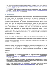 - TJP – The Jerusalem Post (19.11.2019): High Court drops the ball on Jewish Nation-State Law – analysis, https://www.jpost.com/israel-news/high-court-drops-the-ball-on-jewish-nation-state- law-analysis-608296, Zugriff - TI – Times of Israel (16.8.2019): Nation-state law to be included in Israeli high school curriculum – report, https://www.timesofisrael.com/nation-state-law-to-be-included-in-israeli- high-school-curriculum-report/, Zugriff 14.5.2020 3. Sicherheitslage Das deutsche Auswärtige Amt warnt bei Reisen nach Israel vor Menschenansammlungen, mahnt zu erhöhter Vorsicht bei Bushaltestellen und Bahnhöfen, weil weiterhin Terroranschläge im öffentlichen Raum im Bereich des Möglichen liegen, auch wenn deren Zahl in den letzten Jahren zurückging. Israel gilt weiterhin als Angriffsziel islamistischer Terrorgruppen (AA 17.4.2020). Ähnlich warnt auch das österreichische Außenministerium (BMEIA) vor den Risiken von Anschlägen an Orten mit vielen Menschen wie z.B. religiöse Stätten, öffentliche Verkehrsmittel sowie Lokalen, Märkten etc. Das BMEIA geht davon aus, dass weiter mit „vereinzelten Anschlägen“ unter Verwendung von Messern oder Autos zu rechnen ist (BMEIA 1.7.2020). Freedom House geht von einem anhaltenden Risiko für israelische Sicherheitskräfte und ZivilistInnen bzgl. Terrorangriffen kleinen Maßstabs aus, wie etwa Messerangriffe und Niederfahren mit einem Fahrzeug (FH 4.3.2020). Von 1. Jänner 2015 um 17. September 2019 wurden der Datenbank des UN-Büros für die Koordinierung humanitärer Angelegenheiten (UNOCHA) zufolge fünfzehn Israelis in Israel, davon 10 Siedler, getötet (OCHA o.D.a). 183 Israelis in Israel wurden im Zeitraum von 1. Jänner 2015 bis 22.4.2020 verletzt (OCHA o.D.b). Das BMEIA bewertet die derzeitige Sicherheitslage im Staat Israel im Zusammenhang mit der zunehmenden Ausbreitung des Coronavirus (COVID-19) und damit einhergehenden massiven Einschränkungen im Reiseverkehr als „hohes Sicherheitsrisiko (Sicherheitsstufe 4)“ (BMEIA 14.4.2020). Quellen: - AA – Auswärtiges Amt (17.4.2020): Israel: Reise- und Sicherheitshinweise (Teilreisewarnung Palästinensische Gebiete – Gaza-Streifen), https://www.auswaertiges-amt.de/de/ReiseUndSicherheit/israelsicherheit/203814#content_0, Zugriff 22.4.2020 - BMEIA – Bundesministerium Europäische und internationale Angelegenheiten (1.7.2020): Israel Stand 01.07.2020 (Unverändert gültig seit: 08.06.2020), https://www.bmeia.gv.at/reise- aufenthalt/reiseinformation/land/israel/, Zugriff 1.7.2020 - OCHA – United Nations Office for the Coordination of Humanitarian Affairs (o.D.a): Data on caualties – Israeli fatalities, https://www.ochaopt.org/data/casualties, Zugriff 14.5.2020 .BFA Bundesamt für Fremdenwesen und Asyl Seite 16 von 57