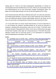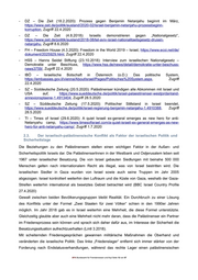 - DZ – Die Zeit (18.2.2020): Prozess gegen Benjamin Netanjahu beginnt im März, https://www.zeit.de/politik/ausland/2020-02/israel-benjamin-netanjahu-prozessbeginn- korruption, Zugriff 22.4.2020 - DZ – Die Zeit (4.8.2018): Israelis demonstrieren gegen „Nationalgesetz“, https://www.zeit.de/politik/ausland/2018-08/tel-aviv-israel-nationalitaetsgesetz-drusen- netanjahu, Zugriff 8.6.2020 - FH – Freedom House (4.3.2020): Freedom in the World 2019 – Israel, https://www.ecoi.net/de/ dokument/2025929.html, Zugriff 22.4.2020 - HSS – Hanns Seidel Stiftung (23.10.2018): Interview zum israelischen Nationalgesetz – Demokratie unter Beschluss, https://www.hss.de/news/detail/demokratie-unter-beschuss- news3759/, Zugriff 22.4.2020 - IBÖ – Israelische Botschaft in Österreich (o.D.): Das politische System, https://embassies.gov.il/vienna/AboutIsrael/Pages/Politisches%20System.aspx, Zugriff 22.4.2020 - SZ – Süddeutsche Zeitung (20.5.2020): Palästinenser kündigen alle Abkommen mit Israel und USA auf, https://www.sueddeutsche.de/politik/israel-palaestinenser-westjordanland- annexionsplaene-1.4913404, Zugriff 28.5.2020 - SZ – Süddeutsche Zeitung (17.5.2020): Politischer Stillstand in Israel beendet, https://www.sueddeutsche.de/politik/israel-regierung-benjamin-netanjahu-1.4910388, Zugriff 28.5.2020 - TI – Times of Israel (29.6.2020): A quiet Israeli ex-general emerges as new hero for anti- Netanyahu camp, https://www.timesofisrael.com/a-quiet-israeli-ex-general-emerges-as-new- hero-for-anti-netanyahu-camp/, Zugriff 1.7.2020 2.3. Der israelisch-palästinensische Konflikt als Faktor der israelischen Politik und Sicherheitslage Die Beziehungen zu den Palästinensern stellen einen wichtigen Faktor in der Außen- und Sicherheitspolitik Israels dar. Die PalästinenserInnen in der Westbank und Ostjerusalem leben seit 1967 unter israelischer Besatzung. Die von Israel gebauten Siedlungen mit beinahe 500 000 Menschen gelten nach internationalem Recht als illegal, was von Israel bestritten wird. Die israelischen Siedler in Gaza wurden von Israel sowie auch seine Truppen im Jahr 2005 abgezogen. Israel kontrolliert weiterhin den Luftraum und die Küste von Gaza, weshalb der Gaza- Streifen weiterhin international als besetztes Gebiet betrachtet wird (BBC Israel Country Profile 27.4.2020) Gewalt zwischen beiden Bevölkerungsgruppen bleibt Realität. Ein Durchbruch zu einer Lösung des Konflikts unter der Formel „Zwei Staaten für zwei Völker“ schien in den 1990er Jahren möglich. Im Jahr 2018 gab es in Israel weiterhin eine Mehrheit, die diese Formel unterstützte. Gleichzeitig glaubte aber auch eine Mehrheit nicht mehr daran, dass die Palästinenser ein Partner im Friedensprozess sein können und sprach sich daher dafür aus, im Interesse der Sicherheit die Besatzungssituation aufrechtzuerhalten (Lintl 3.2018). Mit scheiternden Friedensgesprächen gewannen militärische Maßnahmen die Oberhand und veränderten die israelische Politik: Das linke „Friedenslager“ entfernt sich immer stärker von der Forderung nach Endstatusverhandlungen, während das rechte Lager einen palästinensischen .BFA Bundesamt für Fremdenwesen und Asyl Seite 12 von 57