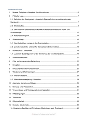Hinweis: Im vorliegenden Länderinformationsblatt erfolgt keine Berücksichtigung der aktuellen CORONA-VIRUS-PANDEMIE (COVID-19), weil die zur Bekämpfung der Krankheit eingeleiteten oder noch einzuleitenden Maßnahmen ständigen Änderungen unterworfen sind und zu deren Auswirkungen zum gegenwärtigen Zeitpunkt Informationen fehlen. Insbesondere können zum gegenwärtigen Zeitpunkt keine seriösen Informationen zu den Auswirkungen der Pandemie auf das Gesundheitswesen, auf Versorgungslage sowie auf Bewegungs- und Reisefreiheit der Bürgerinnen und Bürger sowie generell zu politischen, wirtschaftlichen, sozialen und anderen Folgen zusammengestellt werden. Länderspezifische Anmerkungen Das LIB bezieht sich ausschließlich auf das Territorium des Staates Israel innerhalb der von Österreich anerkannten Grenzen. Erwähnungen von Umständen, welche sich auf Gebiete beziehen, über welche Israel über seine anerkannten Grenzen hinaus eine maßgebliche Kontrolle ausübt, sind nicht als Anerkennung zu verstehen, sondern als Hintergrundinformation für die Lage im von Österreich anerkannten Staatsgebiet Israels. Die betreffenden Gebiete außerhalb des Staates Israel sind: - die Golan-Höhen, - die Westbank, - Ost-Jerusalem, - der Gaza-Streifen. Ergo wird nicht auf die Lage der israelischen BürgerInnen in den international abgelehnten Siedlungen eingegangen. Entwicklungen in den genannten Gebie- ten können Einfluss auf die Sicherheitslage im Staat Israel haben. Völkerrechtliche und menschenrechtliche Fragestellungen ergeben sich vor allem aus der Lage und der israelischen Politik bzgl. der Golan-Höhen, Ost-Jerusalem, Westbank und Gaza-Streifen. Wo sich diese im Staat Israel manifestieren, werden sie in diesem LIB be- rücksichtigt. Ansonsten fallen diese in die Zuständigkeit der LIBs zu diesen Gebieten. .BFA Bundesamt für Fremdenwesen und Asyl Seite 3von 57