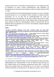 .BFA Bundesamt für Fremdenwesen und Asyl Seite 17 von 40 11. Allgemeine Menschenrechtslage Die jordanische Verfassung garantiert grundlegende bürgerliche Freiheitsrechte (USDOS 20.3.2023). Dennoch sind wichtige Grundrechte und -freiheiten nach wie vor Gegenstand staatlicher Eingriffe, wobei sich die Regierung auf den Schutz der nationalen Sicherheit beruft (ICNL 12.1.2024): Die Regierung stützt sich bei Straftaten im Zusammenhang mit der Meinungsfreiheit und der freien Meinungsäußerung regelmäßig auf das Gesetz zur Terrorismusbekämpfung, was zur Verhaftung und strafrechtlichen Verfolgung einer Reihe von Journalisten führte (OHCHR 31.12.2021; vgl. OHCHR 14.11.2023). Die jordanische Verfassung überträgt alle Fragen des Personenstandsrechts von Muslimen an spezielle Gerichte, die familienbezogene Fälle auf der Grundlage der Auslegung des islamischen Rechts, der Scharia, behandeln. Scharia-Gerichte behandeln Frauen vor dem Gesetz nicht als gleichgestellt (Al-Jazeera 18.2.2022; vgl. USDOS 20.3.2023). Jordanien verfügt in Übereinstimmung mit den einschlägigen UN-Konventionen über ein staatlich gelenktes nationales Menschenrechtszentrum, das National Center for Human Rights (NCHR) (USDOS 20.3.2023). Das Zentrum hat ein umfassendes Menschenrechtsmandat und befasst sich mit Fällen von Menschenrechtsverletzungen, Beschwerden, Aufklärung und Förderung, Überwachung und Integration der Menschenrechte in die jordanische Gesetzgebung und Praxis (APF 20.5.2023). (Anm.: Für Informationen zu Menschenrechtsorganisationen siehe Kapitel „NGOs und Menschenrechtsaktivisten“.) Die Straffreiheit bei Menschenrechtsverletzungen blieb bestehen, obwohl die Regierung einige begrenzte Schritte unternimmt, um gegen Beamte, die Menschenrechtsverletzungen begangen hatten, zu ermitteln, sie strafrechtlich zu verfolgen und zu bestrafen. Informationen über die Ergebnisse dieser Maßnahmen sind nicht für alle Fälle öffentlich zugänglich. Fehlende Transparenz bei Ermittlungen und Gerichtsverfahren verstärkten innerhalb der Bevölkerung den Eindruck von Straflosigkeit (USDOS 20.3.2023). NGOs meldeten einzelne Fälle von Misshandlungen. Im Laufe des Jahres 2022 gab es Beschwerden über Misshandlungen durch den Geheimdienst d GID (General Intelligence Directory) und durch die Strafverfolgungsbehörde PSD (Public Security Directorate) Örtliche NGOs berichteten, dass Folterungen in Haftanstalten weiterhin bestehen, Bürger diese jedoch aus Angst vor Repressalien nicht melden. Die Behörden beschränken den Zugang zu Informationen über die Untersuchungsergebnisse von Folter- oder Misshandlungsfällen. Zudem melden NGOs weitverbreitete Misshandlungen Inhaftierter durch die Polizei (USDOS 20.3.2023). Es kommt auch zu Menschenrechtsverletzungen im Umgang mit Arbeitsmigranten. Jordanien beherbergte im Jahr 2023 schätzungsweise 49.000 ausländische Hausangestellte, vor allem von den Philippinen, Sri Lanka und Indonesien. NGOs verwiesen Hausangestellte, die mehrfach