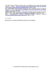 .BFA Bundesamt für Fremdenwesen und Asyl Seite 40 von 40 - The Jordan Times (27.8.2024): Concerns grow over healthcare service quality with increased insurance coverage, https://www.jordantimes.com/news/local/concerns-grow-over-healthcare- service-quality-increased-insurance-coverage%C2%A0, Zugriff 1.2.2024 - UN – United Nations Jordan (4.8.2020): Covering the cost of healthcare remains a struggle for refugees in Jordan, https://jordan.un.org/en/86561-covering-cost-healthcare-remains-struggle- refugees-jordan, Zugriff 25.1.2024 - USDOS – United States Department of State [USA] (20.3.2023): 2022 Country Report on Human Rights Practices: Jordan, https://www.ecoi.net/de/dokument/2089239.html, Zugriff 25.1.2024 - WKO – Wirtschaftskammer Österreich [Österreich] (10.2023): Länderprofil Jordanien, http://wko.at/statistik/laenderprofile/lp-jordanien.pdf, Zugriff 25.1.2024 23. Rückkehr Informationen zum Umgang mit Rückkehrern stehen nicht zur Verfügung.