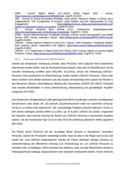 - HRW - Human Rights Watch (12.1.2023): World Report 2023 – Kenya, https://www.ecoi.net/de/dokument/2085468.html, Zugriff 1.8.2023 - JSE - Journal of Social Encounters [Presbey, Gail) (2022): Women’s Rights in Kenya since Independence: The Complexities of Kenya’s Legal System and the Opportunities of Civic Engagement, https://digitalcommons.csbsju.edu/cgi/viewcontent.cgi? article=1113&context=social_encounters, Zugriff 8.8.2023 - KE - Kenyan Embassy Bern [Kenia] (o.D.): Kenianische Staatsbürgerschaft, https://kenyaembassy-bern.ch/de/kenyan-citizenship/, Zugriff 31.7.2023 - KNBS - Kenya National Bureau of Statistics [Kenia] (1.2023): Kenya Demographic and Health Survey 2022. Kenya Indicators Report, https://dhsprogram.com/pubs/pdf/PR143/PR143.pdf, Zugriff 8.8.2023 - UNICEF - United Nations Children's Fund (o.D.): Kenya: Child Protection. Protecting children from violence, abuse, exploitation and neglect, https://www.unicef.org/kenya/child-protection, Zugriff 8.8.2023 - USDOS - U.S. Department of State [USA] (20.3.2023): 2022 Country Report on Human Rights Practices: Kenya, https://www.ecoi.net/de/dokument/2089241.html, Zugriff 31.7.2023 15.3. Homosexuelle/Sexuelle Minderheiten Obwohl die kenianische Verfassung vorsieht, dass Personen nicht aufgrund ihres Geschlechts diskriminiert werden dürfen, und die Rechtsprechung erkannte, dass dies im Einzelfall auch auf die sexuelle Orientierung zutreffen kann (NGLHRC 18.3.2022), schützt die Verfassung LGBTQI+- Personen nicht ausdrücklich vor Diskriminierung. Zudem werden LGBTQI+-Personen, -Paare oder deren Familien nicht offiziell anerkannt und das Gesetz berücksichtigt nicht explizit ihre Rechte in den Bereichen Wohnen, Beschäftigung, Bildung oder Gesundheit (USDOS 20.3.2023). Prinzipiell sind sexuelle Minderheiten in Kenia Diskriminierung, Misshandlung und gewalttätigen Angriffen ausgesetzt (FH 2023). Das kenianische Strafgesetzbuch stellt gleichgeschlechtliche Handlungen zwischen einwilligenden Erwachsenen unter Strafe. Art. 162 bestraft „Geschlechtsverkehr wider der natürlichen Ordnung“ mit bis zu 14 Jahren Haft, während Art. 165 „unanständige Praktiken zwischen Männern“ mit bis zu fünf Jahren Gefängnis ahndet (HRW 12.1.2023; vgl. AI 6.2023; USDOS 20.3.2023). Ungeachtet der Tatsache, dass manche Gerichte die Rechte von LGBTQI+-Personen in bestimmten Aspekten wahren, hat der kenianische High Court im Mai 2019 die Aufhebung ebenjener Artikel abgelehnt (BS 2022). Die Polizei nimmt Personen auf der Grundlage dieser Gesetze in Gewahrsam, besonders Personen, welche der Prostitution verdächtigt werden, lässt sie aber in der Regel nach kurzer Zeit wieder frei. Laut LGBTQI+-Organisationen wendet die Polizei allerdings häufiger Gesetze zur Aufrechterhaltung der öffentlichen Ordnung (z.B. Ruhestörung) an, um LGBTQI+-Personen zu verhaften oder zu belästigen. NGOs berichten des Weiteren, dass sexuelle Minderheiten oftmals in Polizeigewahrsam belästigt, eingeschüchtert oder körperlich misshandelt werden. Ferner droht die .BFA Bundesamt für Fremdenwesen und Asyl Seite 26 von 35