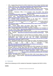 •CPC - Caspian Policy Center (22.11.2024): Central Asia in Focus: Kyrgyz Authorities target another Opposition Party, https://www.caspianpolicy.org/research/central-asia/central-asia- in-focus-kyrgyz-authorities-target-another-opposition-party, Zugriff 15.1.2025 •DIP - Diplomat, The (14.1.2025): Kyrgyzstan’s Social Democrats Under Pressure, https://thediplomat.com/2025/01/kyrgyzstans-social-democrats-under-pressure/, Zugriff 15.1.2025 •EUR-Lex - Publications Office of the European Union (8.11.2023): Civil Society Organisation, https://eur-lex.europa.eu/legal-content/EN/ALL/? uri=LEGISSUM:civil_society_organisation, Zugriff 23.1.2025 •Eurasianet (6.6.2023): Kyrgyzstan: Security services arrest alleged coup plotters from obscure party, https://eurasianet.org/kyrgyzstan-security-services-arrest-alleged-coup- plotters-from-obscure-party, Zugriff 21.1.2025 •FH - Freedom House (29.2.2024): Freedom in the World 2024 - Kyrgyzstan, https://www.ecoi.net/en/document/2108023.html, Zugriff 18.11.2024 •FPRI - Foreign Policy Research Institute (12.4.2024): Kyrgyzstan - Central Asia’s Island of Democrazy sinks into Authoritarianism, https://www.fpri.org/wp-content/uploads/2024/04/kyrgyzstan-island-of-democracy-sinks-1- 1.pdf, Zugriff 15.1.2025 •HRW - Human Rights Watch (16.1.2025): World Report 2025 - Kyrgyzstan, https://www.ecoi.net/en/document/2120094.html, Zugriff 20.1.2025 •HRW – Human Rights Watch (10.12.2024): Kyrgyzstan is Relentless in its Crackdown on Civil and Political Rights, https://www.hrw.org/news/2024/12/10/kyrgyzstan-relentless-its- crackdown-civil-and-political-rights, Zugriff 15.1.2025 •ICNL - The International Center for Not-for-Profit Law (7.11.2024): Civic Freedom Monitor Kyrgyz Republic, https://www.icnl.org/resources/civic-freedom-monitor/kyrgyz, Zugriff 23.1.2025 •ICNL - The International Center for Not-for-Profit Law (4.4.2024): Analysis, Law of the Kyrgyz Republic on Amendments to the Law of the Kyrgyz Republic on Noncommercial Organizations (also known as the Law on Foreign Representatives), https://www.icnl.org/wp-content/uploads/2024.04-Final-Analysis-of-the-KR-Law-on-Foreign- Representatives_eng-vf.pdf, Zugriff 11.12.2024 •IPHR - International Partnership for Human Rights (5.11.2024): The Protection Of Funda- mental Freedoms and Civic Space in Kyrgyzstan: Key Concerns And Recommendations, Briefing paper for the EU, November 2024, https://iphronline.org/wp-content/uploads/2024/11/iphr-briefing-on-civic-space-in- kyrgyzstan-november-2024.pdf, Zugriff 5.12.2024 •IPHR - International Partnership for Human Rights (26.4.2024): Kyrgyzstan: Civic space de- teriorates further as „foreign agent“-style NGO law is adopted and media crackdown widens, https://iphronline.org/articles/kyrgyzstan-civic-space-deteriorates-further-as-foreign- agent-style-ngo-law-is-adopted-and-media-crackdown-widens/, Zugriff 5.12.2024 •ÖB - Österreichische Botschaft in Astana [Österreich] (1.2023): Asylländerbericht Kirgisistan, https://www.ecoi.net/en/file/local/2085308/KIRG_%C3%96B- Bericht_2023_01.pdf, Zugriff 13.1.2025 •USDOS - US Department of State [USA] (23.4.2024): 2023 Country Report on Human Rights Practices - Kyrgyz Republic, https://www.ecoi.net/en/document/2107749.html, Zu- griff 12.11.2024 12. Todesstrafe Artikel 25 der Verfassung von 2021 verbietet die Todesstrafe in Kirgisistan (Verf KIRG 5.5.2021). Quellen: .BFA Bundesamt für Fremdenwesen und Asyl Seite 24 von 43