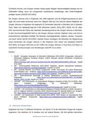 Christliche Kirchen und Gruppen werden häufig wegen illegaler Missionstätigkeit belangt und mit Geldstrafen belegt, wenn sie unregistrierte ausländische Staatsbürger oder Ordensmitglieder predigen lassen (USDOS 26.6.2024). Die Zeugen Jehovas sind in Kirgisistan seit 1998 registriert und die Religionsausübung ist auch legal. Die erste lokale Gemeinde nahm ihre Tätigkeit 1993 auf. Die Zahl der aktiven Mitglieder der Zeugen Jehovas in Kirgisistan mit insgesamt 41 Gemeinden (darunter in Bischkek und in Gebieten Osch, Talas und Jalalabad) liegt bei 5.282 Menschen (Stand: 2021) (ÖB 1.2023). Am 25. März 2021 durchsuchte die Polizei das nationale Verwaltungszentrum der Zeugen Jehovas in Bischkek. In dem Durchsuchungsbefehl hieß es, die Zeugen Jehovas schüren religiösen Hass und sind an extremistischen Aktivitäten beteiligt. Die Beamten beschlagnahmten religiöse Literatur, Computer und einen Server (EAJW 29.9.2022). Darüber hinaus verweigern die Behörden die Registrierung neuer Gemeinden der Zeugen Jehovas in den Regionen Osh, Naryn und Jalalabad (USDOS 26.6.2024). Im August 2024 kam es bei Treffen der Zeugen Jehovas in Kyzyl-Kyia und Naryn zu neuerlichen Durchsuchungen und Verhaftungen (USCIRF 22.11.2024). Quellen: •EAJW - European Assciation of Jehovah’s Witnesses (29.9.2022): Kyrgyzstan: Jehovah’s Witnesses Religious Freedom Report. OSCE Warsaw Human Dimension Conference 26.9.-7.10.2022, https://meetings.odihr.pl/resources/download-file-dds/188/220930163859_0094.pdf, Zugriff 9.12.2024 •EB - Encyclopaedia Britannica (29.5.2023): Madrash, Muslim educational institution, https://www.britannica.com/topic/madrasah, Zugriff 9.12.2024 •ER - Eurasia Review (13.9.2024): Kyrgyzstan: Public Discussion Of Latest Repressive Draft Religion Law – Analysis, https://www.eurasiareview.com/13092024-kyrgyzstan-public- discussion-of-latest-repressive-draft-religion-law-analysis/, Zugriff 9.12.2024 •ÖB - Österreichische Botschaft in Astana [Österreich] (1.2023): Asylländerbericht Kirgisistan, https://www.ecoi.net/en/file/local/2085308/KIRG_%C3%96B- Bericht_2023_01.pdf, Zugriff 13.1.2025 •USCIRF - US Commission on International Religious Freedom [USA] (22.11.2024): Reli- gious Freedom Challenges for Jehovah’s Witnesses, https://www.uscirf.gov/sites/default/files/2024- 11/2024%20Jehovah%27s%20Witness%20Issue%20Update.pdf, Zugriff 9.12.2024 •USCIRF - US Commission on International Religious Freedom [USA] (1.5.2024): Annual re- port on religious freedom (covering 2023), Recommended for Special Watch List: Kyrgyzs- tan, https://www.ecoi.net/en/file/local/2112007/Kyrgyzstan.pdf, Zugriff 9.12.2024 •USDOS - US Department of State [USA] (26.6.2024): 2023 Report on International Reli- gious Freedom: Kyrgyzstan, https://www.ecoi.net/de/dokument/2111899.html, Zugriff 9.12.2024 14. Ethnische Minderheiten Kirgisistan hat circa 7,1 Millionen Einwohner, von denen 74 % der ethnischen Gruppe der Kirgisen angehören. Die restlichen 26 % verteilen sich auf andere Ethnien. Die fünf größten ethnischen .BFA Bundesamt für Fremdenwesen und Asyl Seite 26 von 43