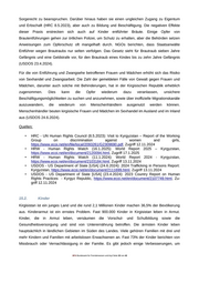 Sorgerecht zu beanspruchen. Darüber hinaus haben sie einen ungleichen Zugang zu Eigentum und Erbschaft (HRC 8.5.2023), aber auch zu Bildung und Beschäftigung. Die negativen Effekte dieser Praxis erstrecken sich auch auf Kinder entführter Bräute. Einige Opfer von Brautentführungen gehen zur örtlichen Polizei, um Schutz zu erhalten, aber die Behörden setzen Anweisungen zum Opferschutz oft mangelhaft durch. NGOs berichten, dass Staatsanwälte Entführer wegen Brautraubs nur selten verfolgen. Das Gesetz sieht für Brautraub sieben Jahre Gefängnis und eine Geldstrafe vor, für den Brautraub eines Kindes bis zu zehn Jahre Gefängnis (USDOS 23.4.2024). Für die von Entführung und Zwangsehe betroffenen Frauen und Mädchen erhöht sich das Risiko von Sexhandel und Zwangsarbeit. Die Zahl der gemeldeten Fälle von Gewalt gegen Frauen und Mädchen, darunter auch solche mit Behinderungen, hat in der Kirgisischen Republik erheblich zugenommen. Dies kann die Opfer wiederum dazu veranlassen, unsichere Beschäftigungsmöglichkeiten zu suchen und anzunehmen, sowie über inoffizielle Migrationskanäle auszuwandern, die wiederum von Menschenhändlern ausgenutzt werden können. Menschenhändler beuten kirgisische Frauen und Mädchen im Sexhandel im Ausland und im Inland aus (USDOS 24.6.2024). Quellen: •HRC - UN Human Rights Council (8.5.2023): Visit to Kyrgyzstan – Report of the Working Group on discrimination against women and girls, https://www.ecoi.net/en/file/local/2093261/G2309690.pdf, Zugriff 12.11.2024 •HRW - Human Rights Watch (16.1.2025): World Report 2025 – Kyrgyzstan, https://www.ecoi.net/en/document/2120094.html, Zugriff 17.1.2025 •HRW - Human Rights Watch (11.1.2024): World Report 2024 - Kyrgyzstan, https://www.ecoi.net/en/document/2103184.html, Zugriff 13.11.2024 •USDOS - US Department of State [USA] (24.6.2024): 2024 Trafficking in Persons Report: Kyrgyzstan, https://www.ecoi.net/en/document/2111699.html, Zugriff 13.11.2024 •USDOS - US Department of State [USA] (23.4.2024): 2023 Country Report on Human Rights Practices - Kyrgyz Republic, https://www.ecoi.net/en/document/2107749.html, Zu- griff 12.11.2024 15.2. Kinder Kirgisistan ist ein junges Land und die rund 2,1 Millionen Kinder machen 36,5% der Bevölkerung aus. Kinderarmut ist ein ernstes Problem. Fast 900.000 Kinder in Kirgisistan leben in Armut. Kinder, die in Armut leben, versäumen die Vorschul- und Schulbildung sowie die Gesundheitsversorgung und sind von Unterernährung betroffen. Die ärmsten Kinder leben hauptsächlich in ländlichen Gebieten im Süden des Landes. Viele gehören Familien mit drei und mehr Kindern und Familien mit arbeitslosen Erwachsenen an. Fast 73% der Kinder berichten von Missbrauch oder Vernachlässigung in der Familie. Es gibt jedoch einige Verbesserungen, um .BFA Bundesamt für Fremdenwesen und Asyl Seite 32 von 43