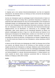https://www.state.gov/reports/2024-investment-climate-statements/kyrgyz-republic/, Zugriff 7.1.2025 7. Ombudsperson In Kirgisistan gibt es drei nationale Menschenrechtsinstitutionen: das Büro der kirgisischen Ombudsperson, das Nationale Zentrum zur Verhütung von Folter und das Büro des Beauftragten für Kinderrechte (HRC 8.5.2023). Das Büro der Ombudsperson agiert als unabhängiger Anwalt für Menschenrechte im Namen von Privatpersonen und NGOs und ist befugt, Fälle zur gerichtlichen Überprüfung zu empfehlen. Zum wiederholten Male stellten Beobachter fest, dass sich die Sicherheitskräfte in einer Atmosphäre der Straflosigkeit bewegen und unabhängig gegen Bürger vorgehen können. Faktoren, die die Anzahl und Art der beim Ombudsperson-Institut eingereichten Beschwerden einschränkten. Obwohl das Büro der Ombudsperson teilweise dazu dient, Beschwerden über Menschenrechtsverletzungen entgegenzunehmen und die Beschwerden zur Untersuchung an die zuständigen Stellen weiterzuleiten, stellen sowohl nationale als auch internationale Beobachter die Effizienz und politische Unabhängigkeit des Büros in Frage. Am 3. Mai 2023 stimmte das Parlament für die Absetzung der Ombudsperson Atyr Abdrakhamatova, nachdem sie in ihrem Bericht vom 19. April 2023 über die Menschenrechtslage im Land systemische Rückschritte „in allen Bereichen, einschließlich des Schutzes der Menschen- und Bürgerrechte und -freiheiten“ festgestellt hatte. Am 17. Mai 2023 ernannte das Parlament eine neue Ombudsperson, Jamiliya Jamanbaeva (USDOS 23.4.2024). Im Bericht vom Mai 2023 brachte eine Arbeitsgruppe des UNHRC ihre Besorgnis über die Pläne zum Ausdruck, das Nationale Zentrum für die Verhütung von Folter aufzulösen und dessen Aufgaben auf das Büro der Ombudsperson zu übertragen. Stattdessen wurde im Bericht gefordert, dass das Nationale Zentrum zur Verhütung von Folter sein unabhängiges Mandat behält sowie das Amt der Ombudsperson mit den international anerkannten Standards für Unabhängigkeit, Pluralität und Rechenschaftspflicht für nationale Menschenrechtsinstitutionen in Einklang gebracht wird. Zudem empfiehlt der Bericht, beiden Institutionen ausreichende Mittel zur Umsetzung ihrer Mandate zur Verfügung zu stellen (HRC 8.5.2023). Quellen: •HRC - UN Human Rights Council (8.5.2023): Visit to Kyrgyzstan – Report of the Working Group on discrimination against women and girls, https://www.ecoi.net/en/file/local/2093261/G2309690.pdf, Zugriff 12.11.2024 •USDOS - US Department of State [USA] (23.4.2024): 2023 Country Report on Human Rights Practices - Kyrgyz Republic, https://www.ecoi.net/en/document/2107749.html, Zu- griff 12.11.2024 .BFA Bundesamt für Fremdenwesen und Asyl Seite 15 von 43