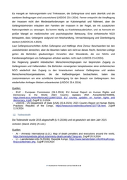 Es mangelt an Nahrungsmitteln und Trinkwasser, die Gefängnisse sind stark überfüllt und die sanitären Bedingungen sind unzureichend (USDOS 23.4.2024). Ferner entspricht die Verpflegung der Insassen nicht den Mindestanforderungen an Kaloriengehalt und Nährwert, aber die Gefängnisbehörden erlaubten den Familien der Insassen in der Regel, sie mit zusätzlichen Nahrungsmitteln zu versorgen. Es kommt häufig zu Krankheitsausbrüchen, und es herrscht ein großer Mangel an medizinischer und psychologischer Betreuung. Eine einheimische NGO behauptete, dass Gefangene aufgrund von Misshandlung, Vernachlässigung und Überbelegung starben (USDOS 23.4.2024). Laut Gefängnisvorschriften dürfen Gefangene und Häftlinge ohne Zensur Beschwerden bei den Justizbehörden einreichen, aber die Beamten halten sich nicht an dieses Recht. Berichten zufolge gehen die Behörden glaubwürdigen Vorwürfen über Missstände, die von NGOs und Familienangehörigen von Gefangenen erhoben werden, nicht nach (USDOS 23.4.2024). Die Regierung gewährt inländischen Menschenrechtsgruppen nur begrenzten Zugang zu Gefängnissen und Haftanstalten. Die Behörden verweigerten beispielsweise einer einheimischen NGO wiederholt den Zugang zu den Innenräumen mehrerer Gefängnisse und andere Menschenrechtsorganisationen, die die Haftbedingungen beobachteten, baten das Justizministerium um eine schriftliche Genehmigung für den Besuch von Gefängnissen. Ihre wiederholten Anfragen blieben unbeantwortet (USDOS 23.4.2024). Quellen: - EUC - European Commission (24.5.2024): EU Annual Report on Human Rights and Democracy in the World; 2023 Country Updates [Ref. Ares(2024)3743899], https://www.ecoi.net/en/file/local/2110897/2023 EU country updates on human rights and democracy_4.pdf, Zugriff 12.9.2024 - USDOS - US Department of State [USA] (20.4.2024): 2023 Country Report on Human Rights Practices: Republic of the Congo, https://www.ecoi.net/en/document/2107738.html, Zugriff 11.9.2024 12. Todesstrafe Die Todesstrafe wurde 2015 abgeschafft (LI 9.2024b) und ist gesetzlich seit dem Jahr 2015 verboten (Stand: 2023) (AI o.D.) Quellen: - AI – Amnesty International (o.D.): Map of death penalties and executions around the world, https://amnestywebsite.github.io/amnesty-death-penalty/?lang=en, Zugriff 20.9.2024 - LI - Laenderdaten.info (9.2024b): Republik Kongo, https://www.laenderdaten.info/Afrika/Kongo- Brazzaville/index.php, Zugriff 19.9.2024 .BFA Bundesamt für Fremdenwesen und Asyl Seite 15 von 22